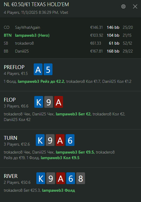 А в другій роздачі, після ставки в 33% по флопу в мультипоті, чому на терні вирішила ставити, коли можна було безкоштовно перевірити рівер, з чого був добір Ах зі старшим кікером тебе б кололи можливо навіть би друге фд, королі та дев'ятки б викидували в мультипоті, рейзи отримуєш від доперів та сетів.