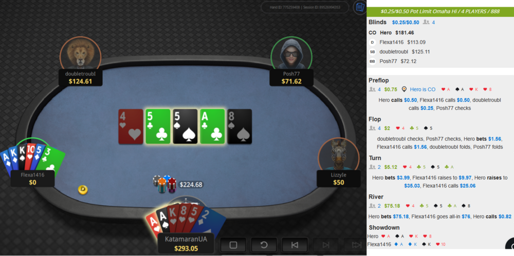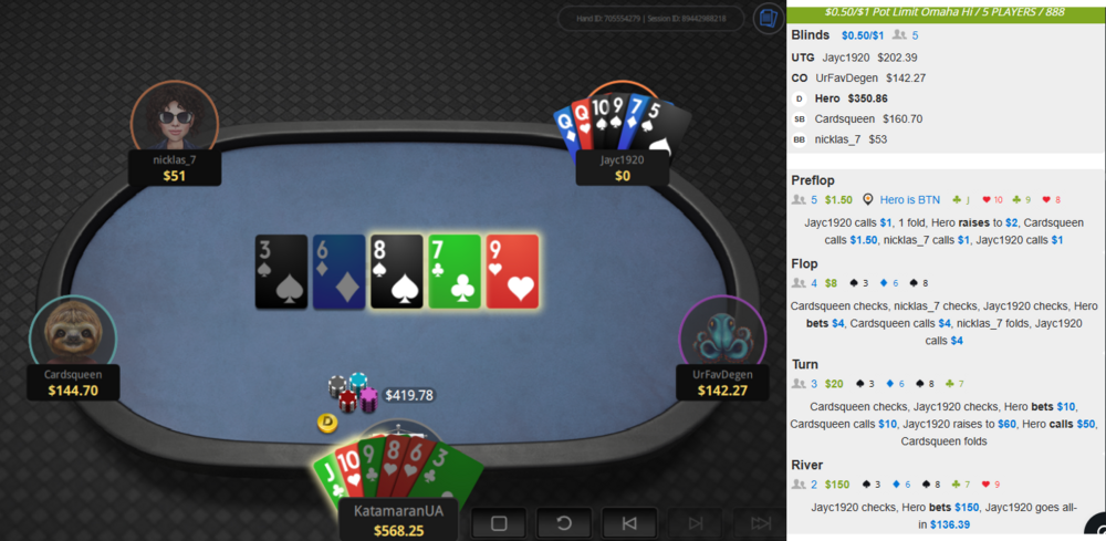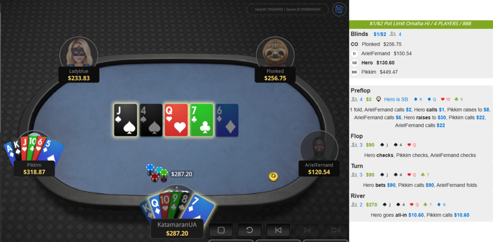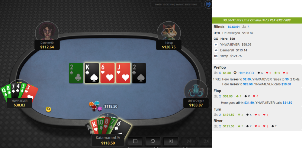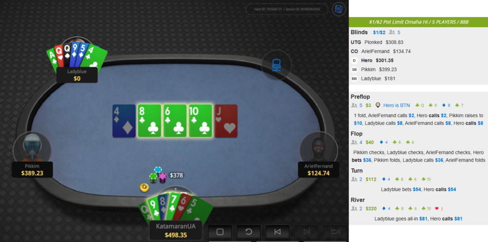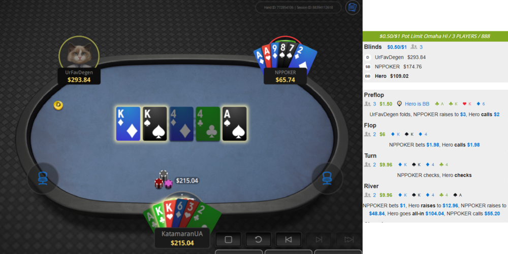 людина ж загалом розважалася певно. бо як і у випадку цієї роздачі, на сусідньому столі оп постійно заходив зі всяким мотлохом, імітував натси постфлоп, аби в кінці засвітити блеф.