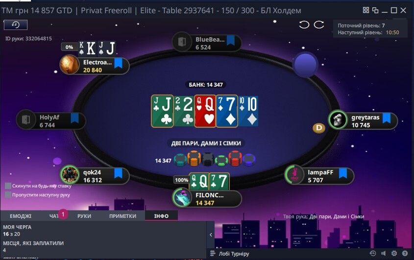 , electroairman зарейзив 2bb ,я колл маємо ФД , оверпару🤩...по флопу я чек (щоб заманити🫣) прилітає пуш, їдемо 👌😎 Є стек, щоб триматися далі в грі😉