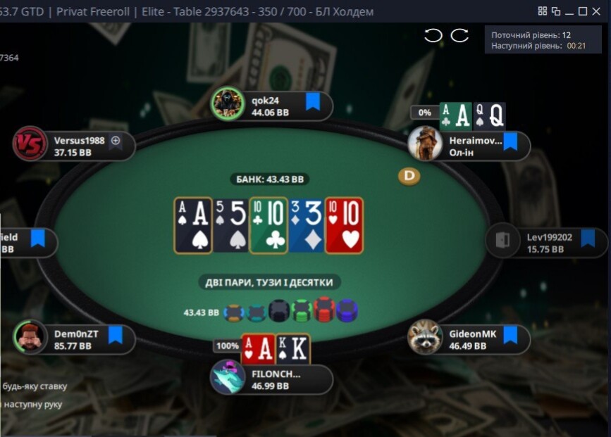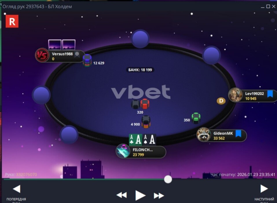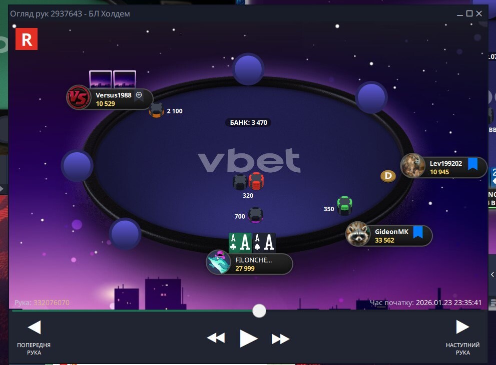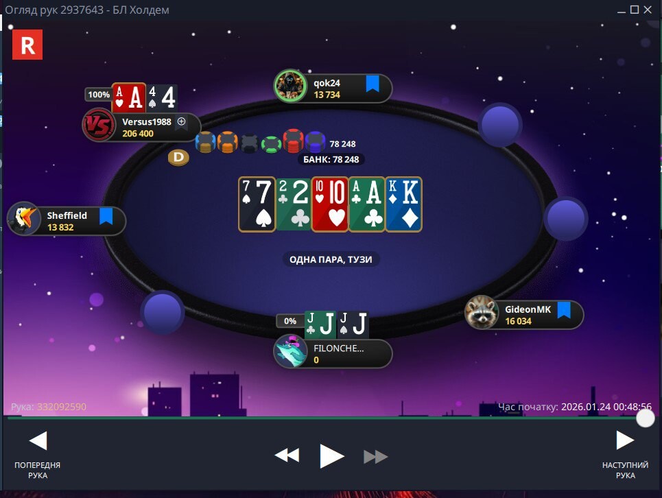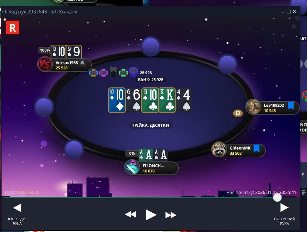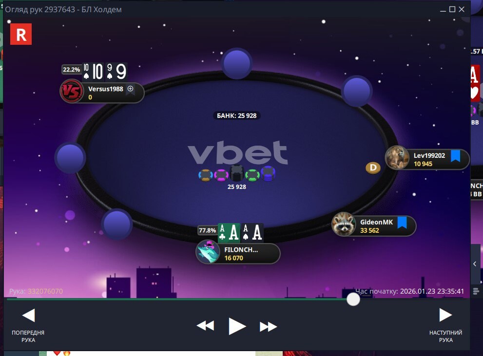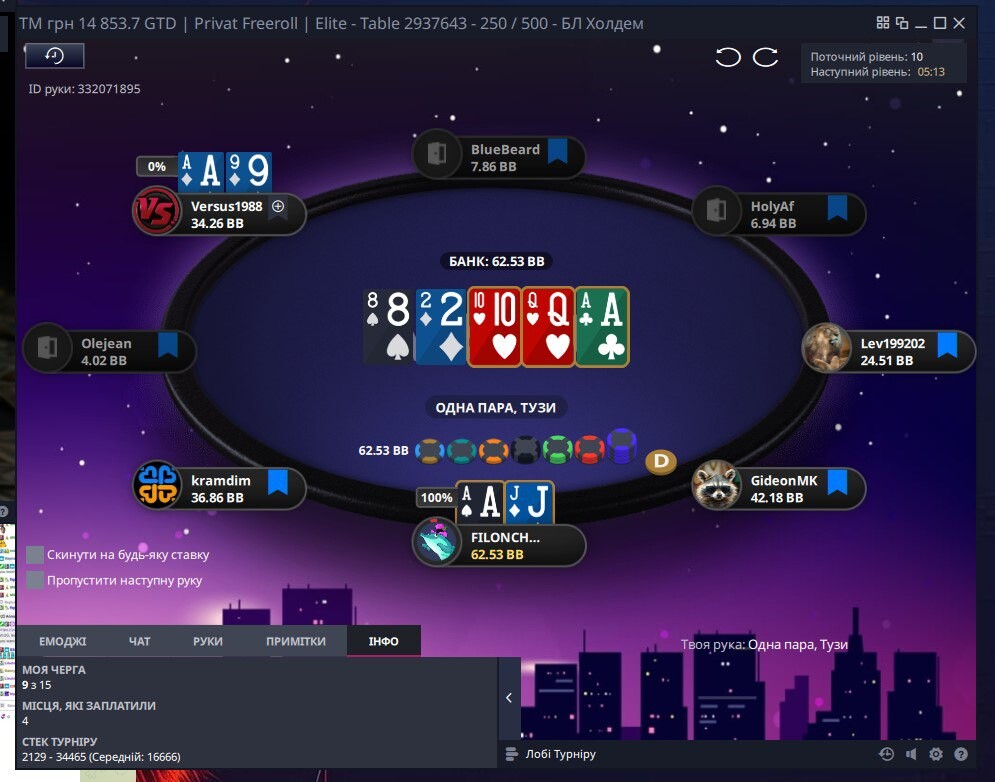Наступний момент до кінця не пам'ятаю,як від початку розвивалась ситуація...але поїхали префлоп проти Versus1988 , доволі вдало 🤩