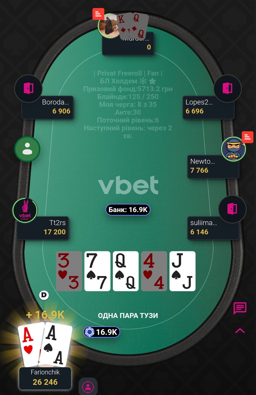 Фінальний стіл.За столом залишається 5 гравців і тут тобі роздали карманих тузів, Один з гравців іде ва-банк: СиняПодвоїти стек з можливістю програшу ...