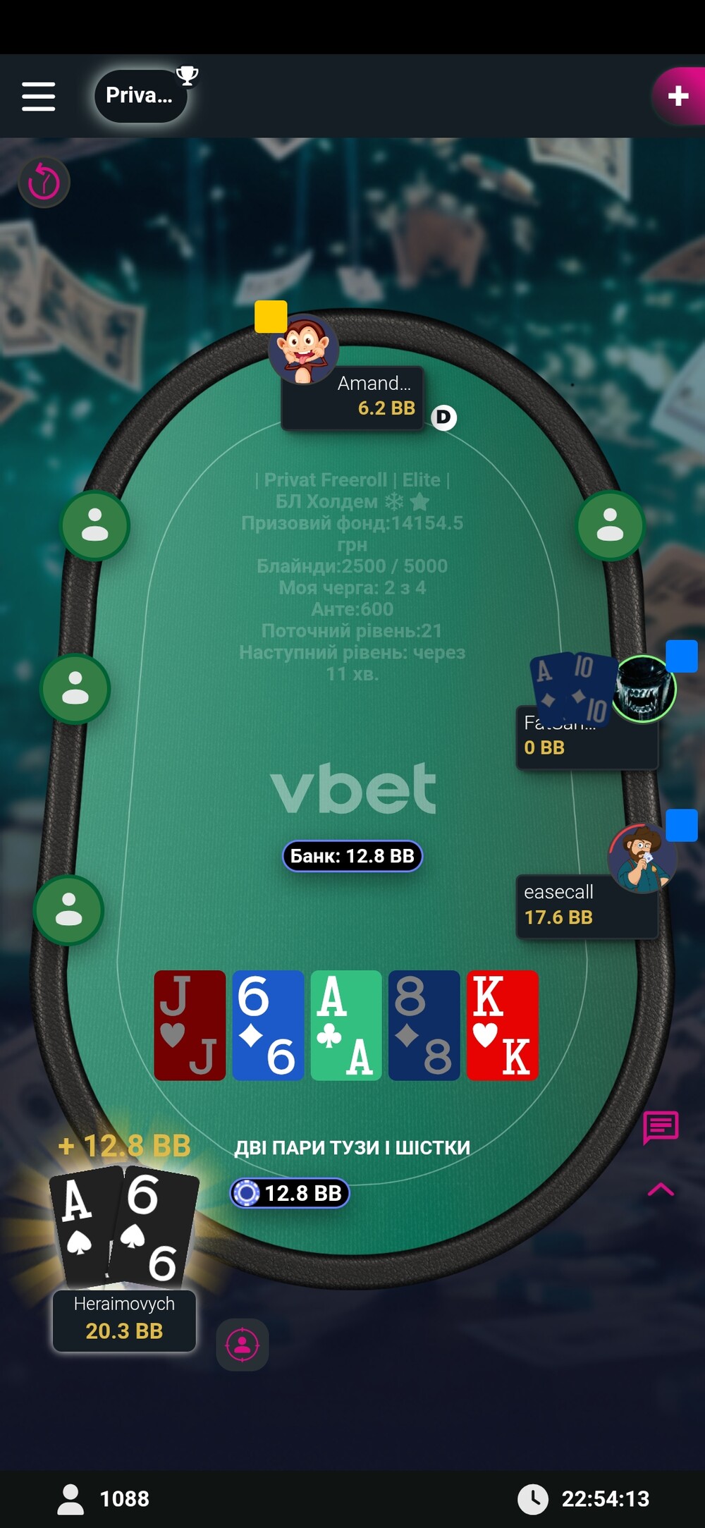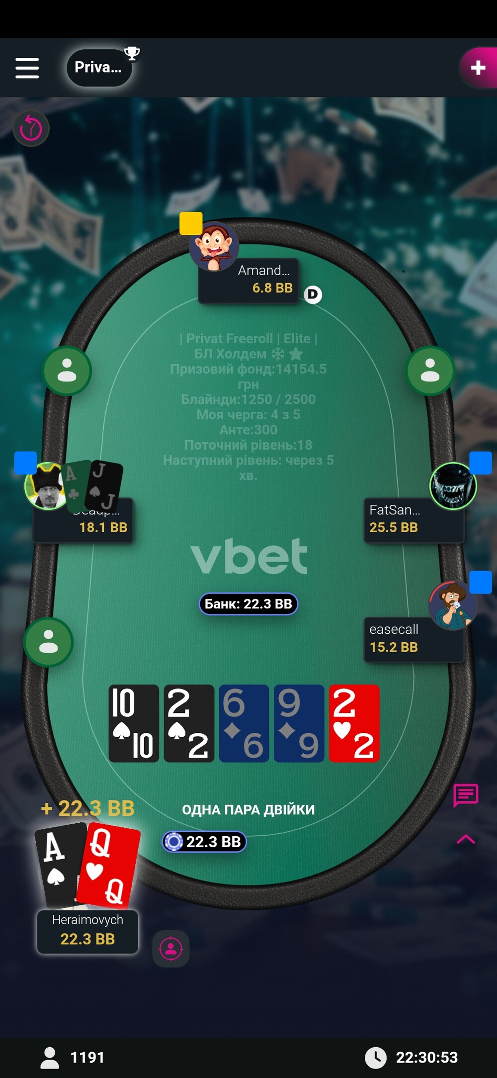 Після перерви нас нарешті залишила Аманда і потім відіграли короткий ХА. Виставились по флопу і опоненту доїхало. Ну значить так потрібно.