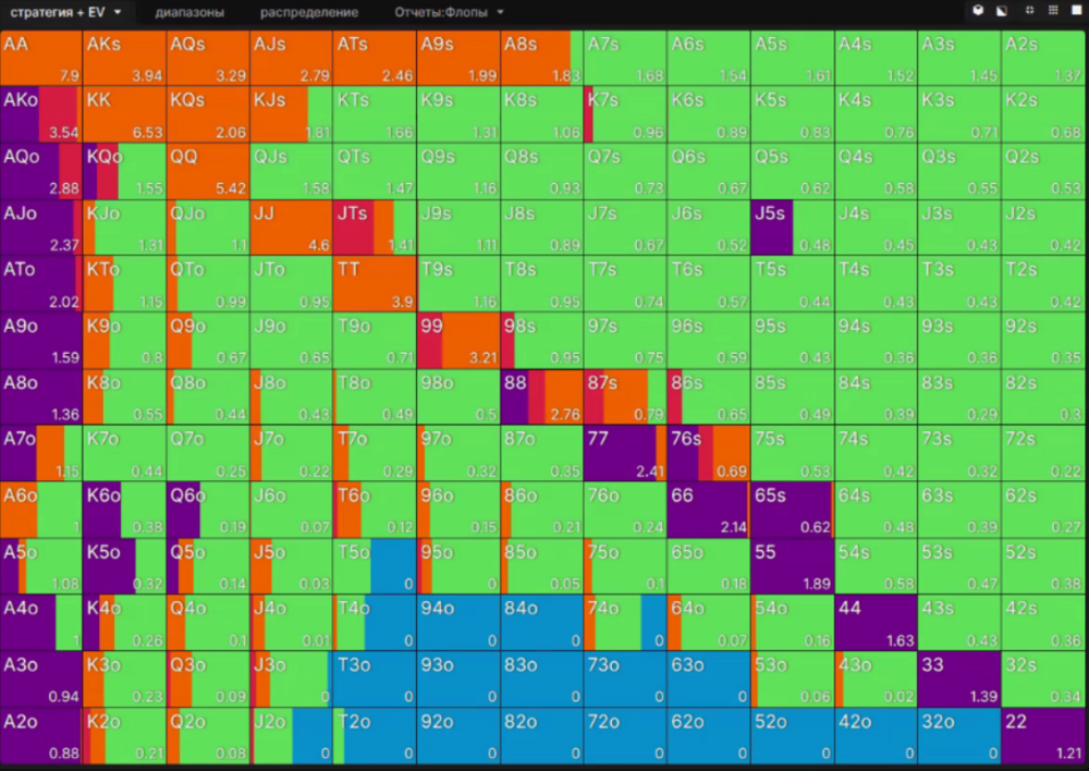 (зелений - кол, помаранчевий - 3бет, фіолетовий - пуш)