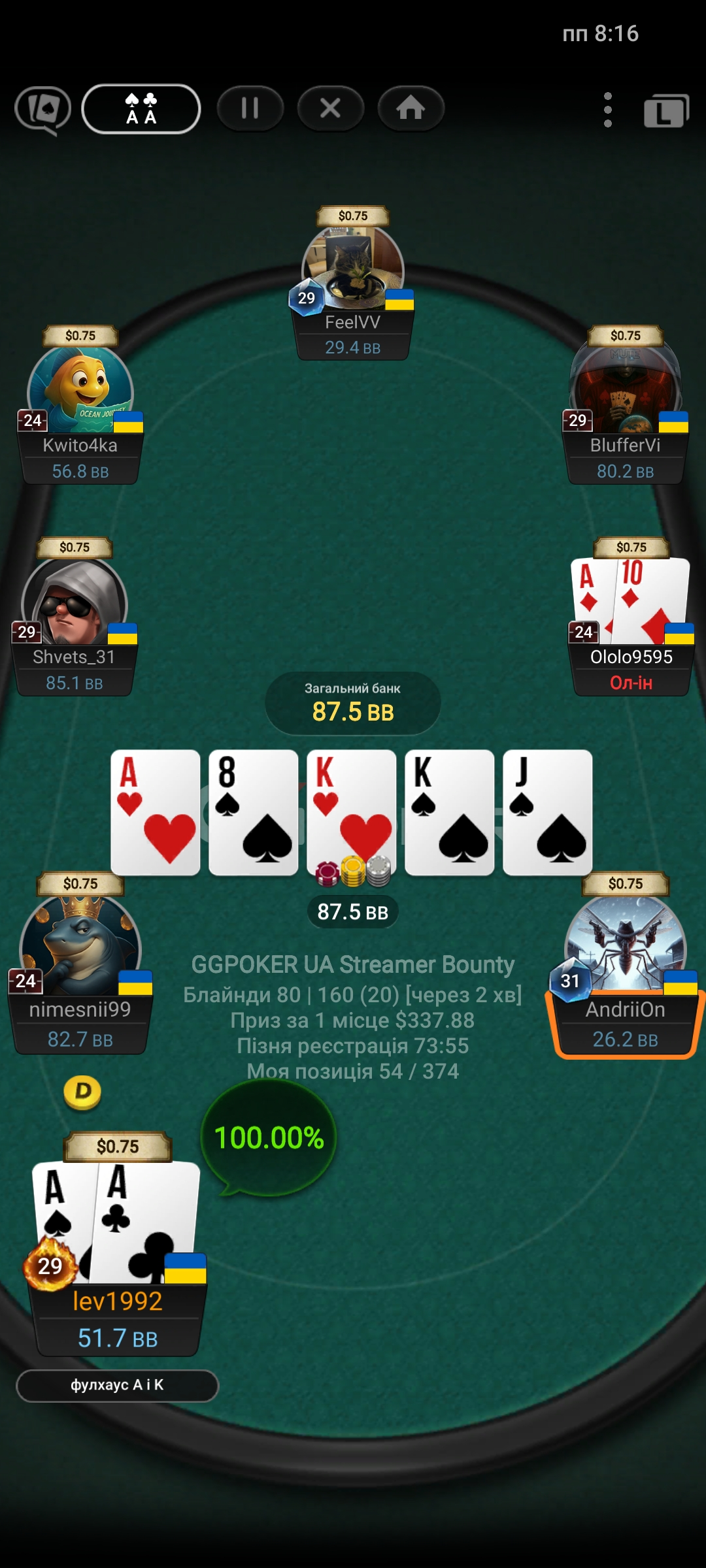 Да проти чіпака виграв би але короткий б забрав свою частину бо у нього КJs і короля поклали на флопі😉