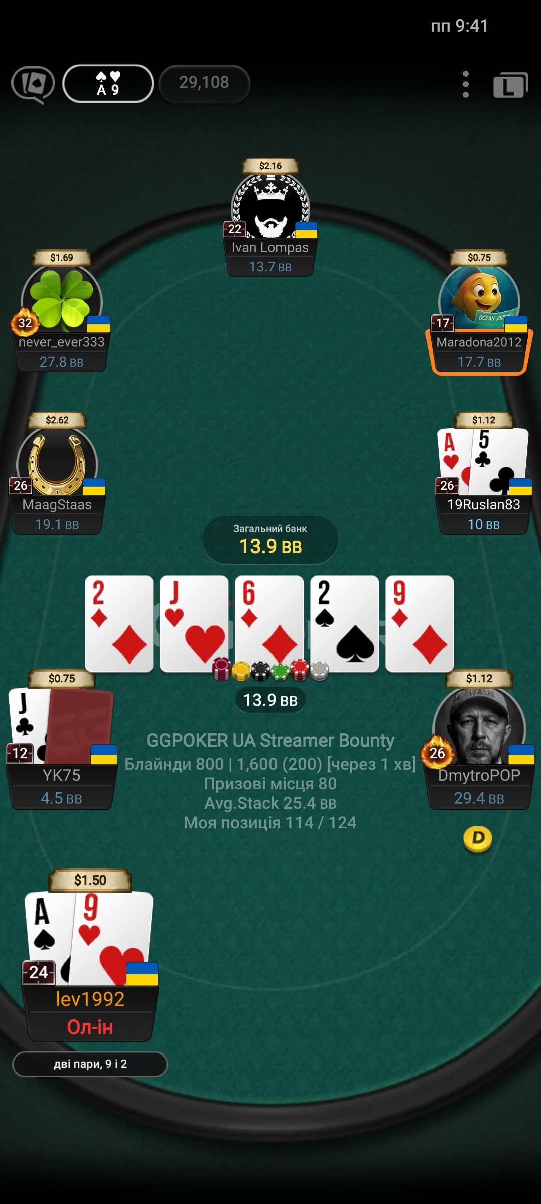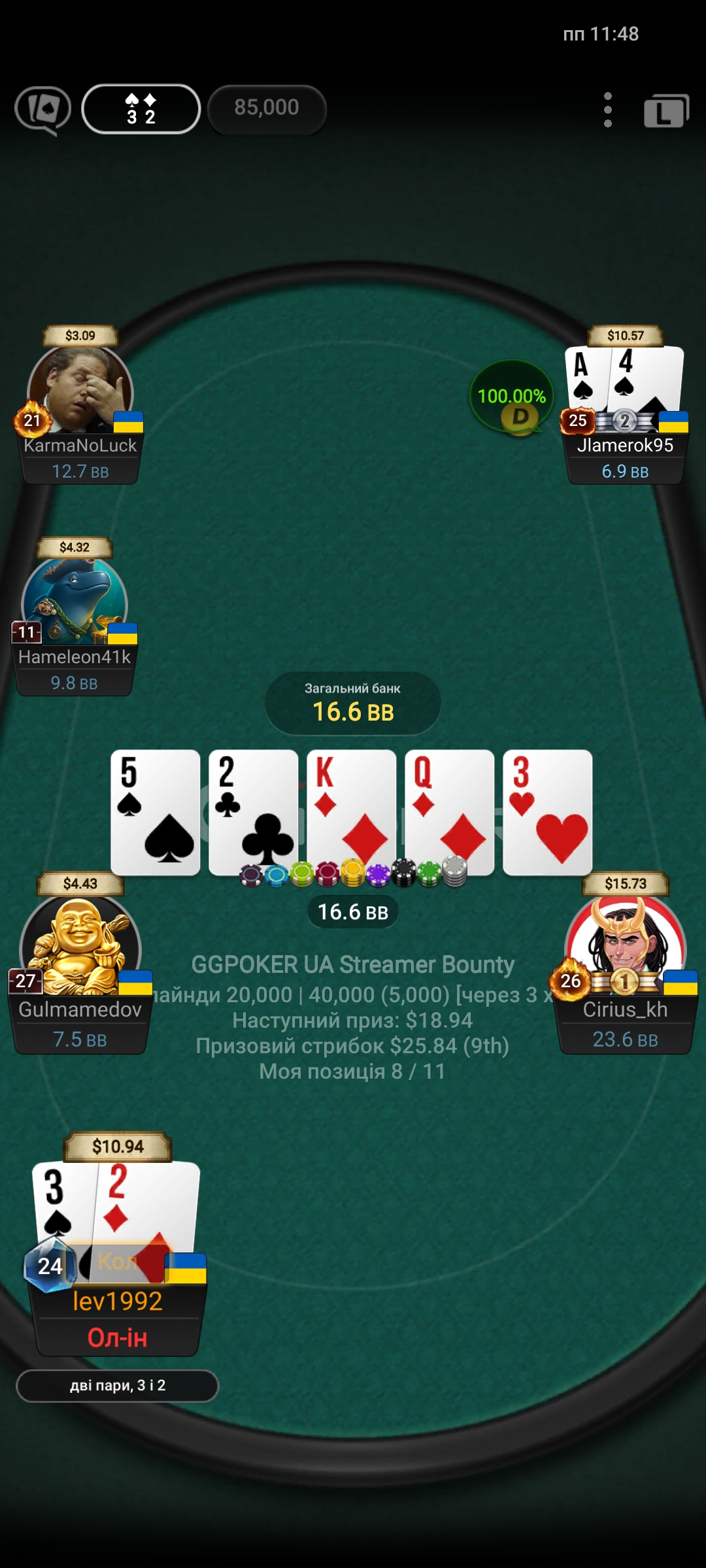 І остання роздача я на ББ з 32 ніхто не рейзить, прочекавши всі вулиці і на рівері наловивши другу пару я захотів щось показати, але не тут то було