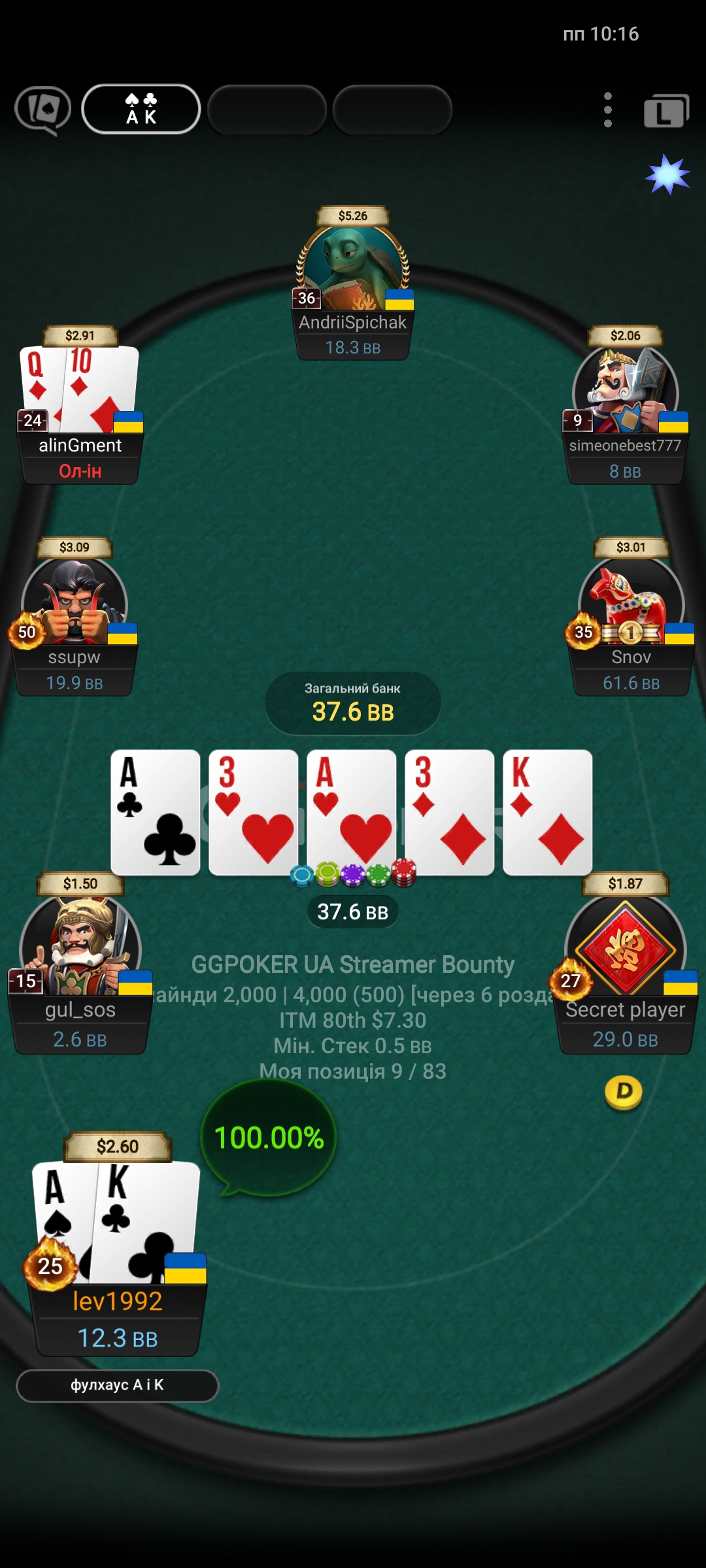 А ось тут сталась доволі цікава роздача: 3 людини до призів, бабл, опонент рейзить префлоп я кол з АК, на флопі випадає два туза і опонент швидкий оллін, я заколив і трішки здивувався побачивши його карти