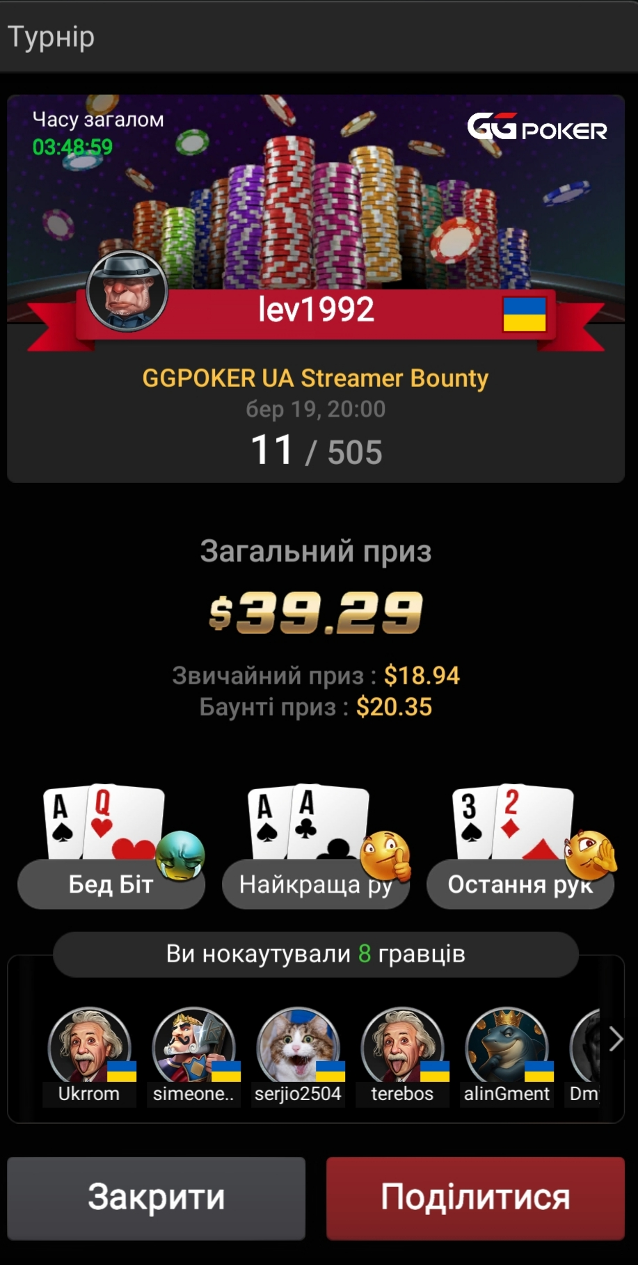 Дякую друже, та да в мене другий стек, це мене і стримало, бо ІТМ лише починався а вилітати з другим стеком не хотілося.. в на рахунок фіналки то після того як ти вилетів я вище 10 нічого не бачив просто 72,73,84 і тому подібні карти🤝