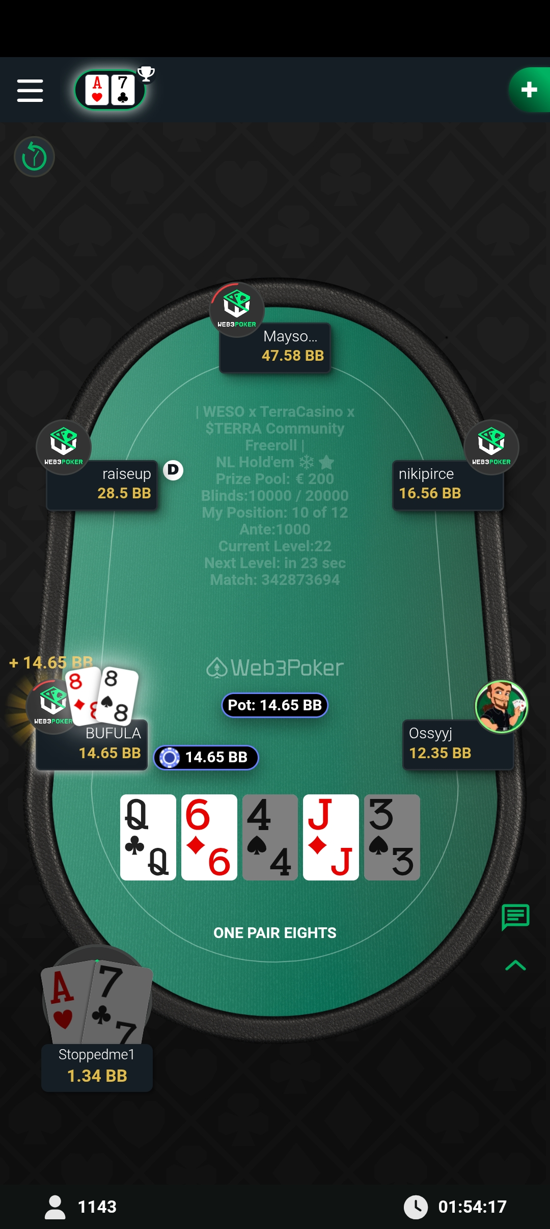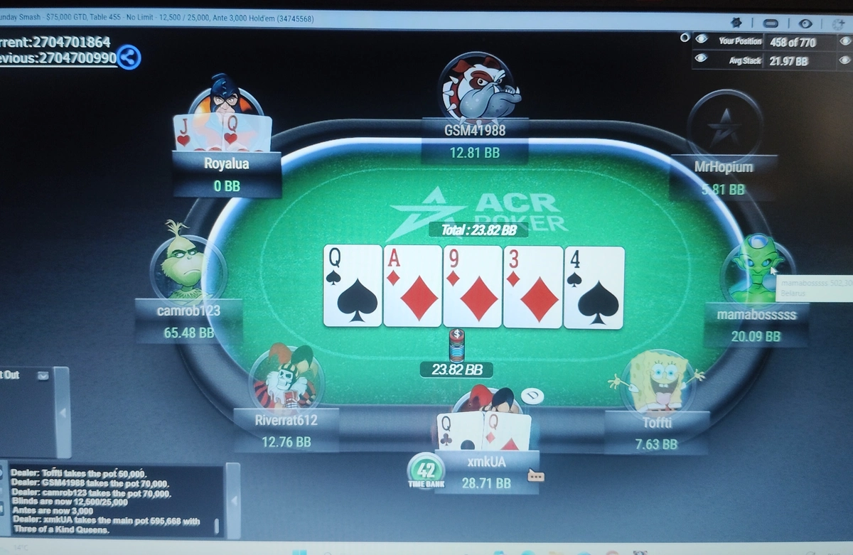 і ось друга роздача вже коли закінчилась лейтрега майже перед ітм, вона дозволила зайти в ітм. Утг сидів майже роздача 20 викидав і тут префлоп пуш ол-ін. Я замислився над тим щоб викидати дам навіть бо він "ніт" чекав на КК/АА. Але все набагато простіше.