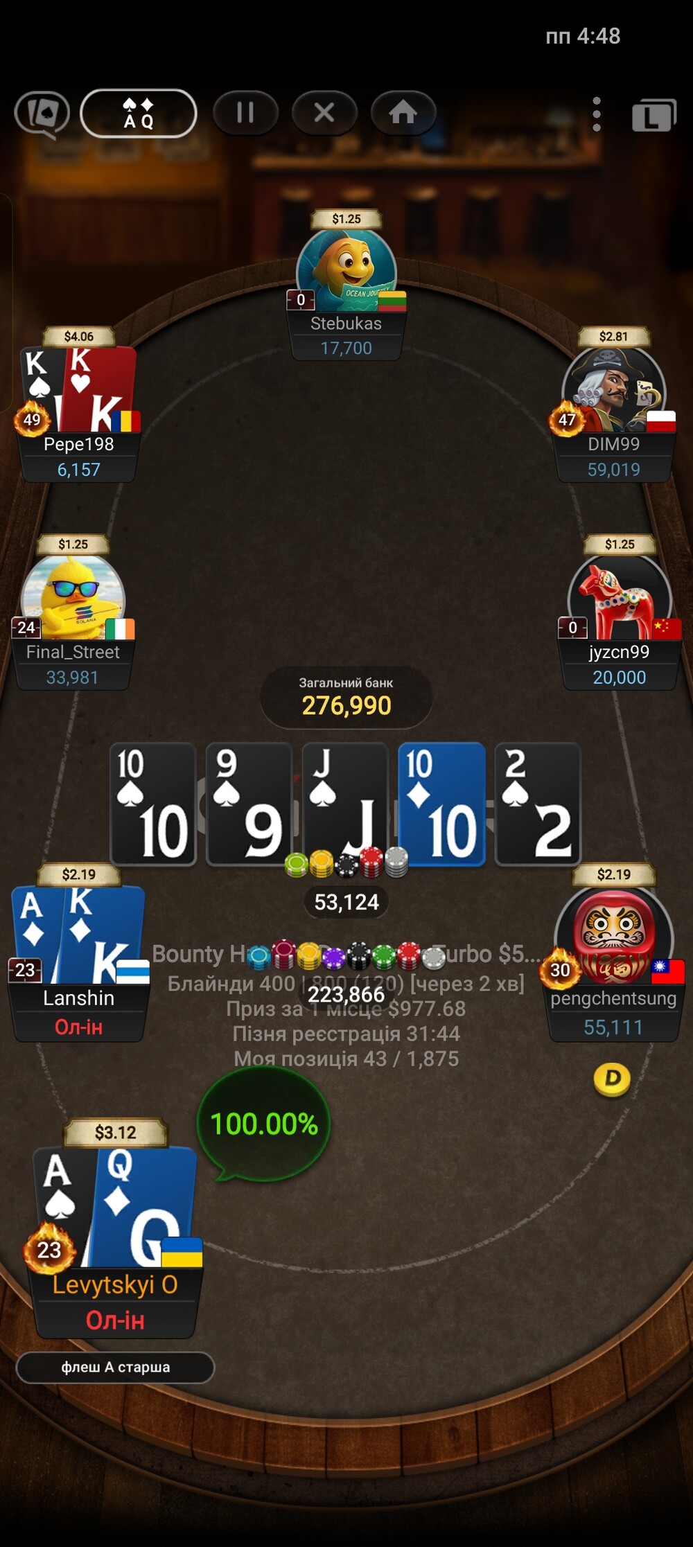 Я дозволив собі зайти подивитись як там справи на GG AoF PLO 2$. Майже на 5-6 роздачі в мене залишилось на один ол-ін... І ось він дивовижний раннер раннер...