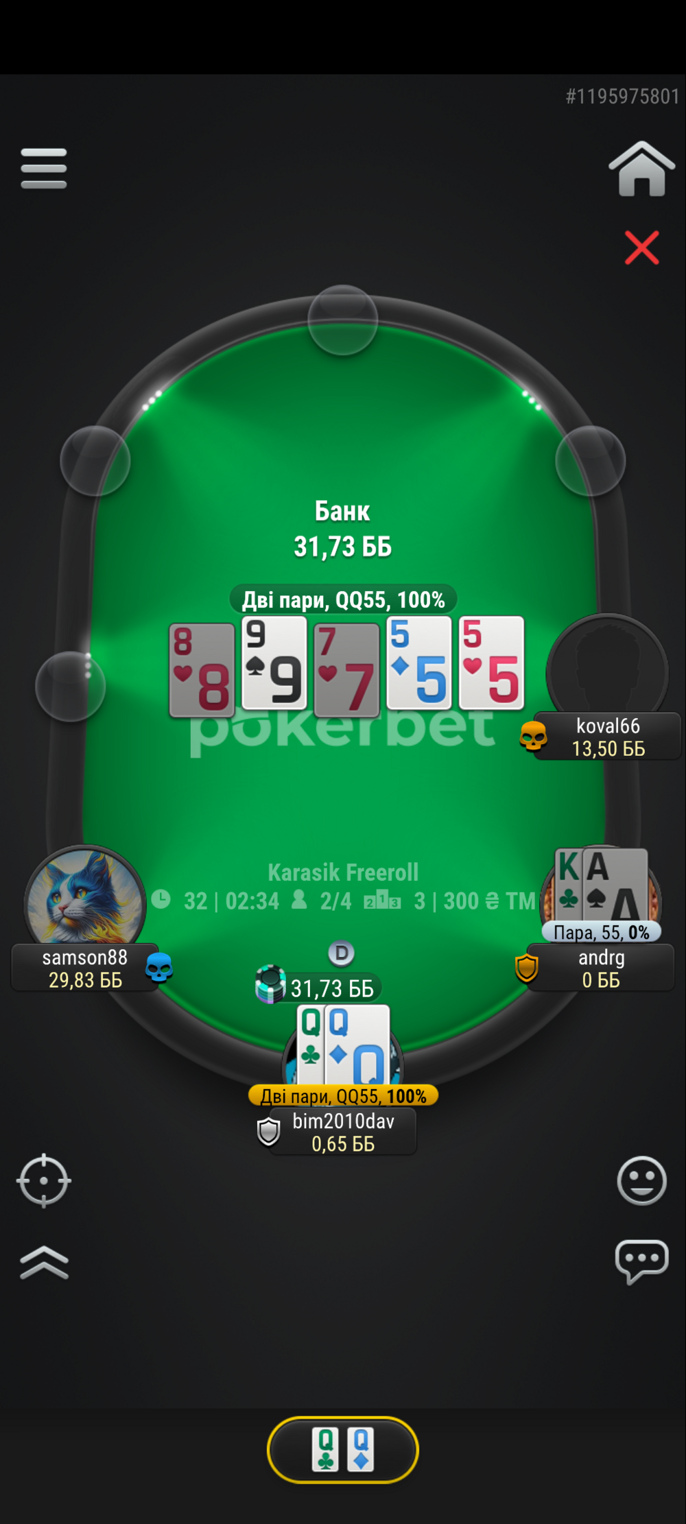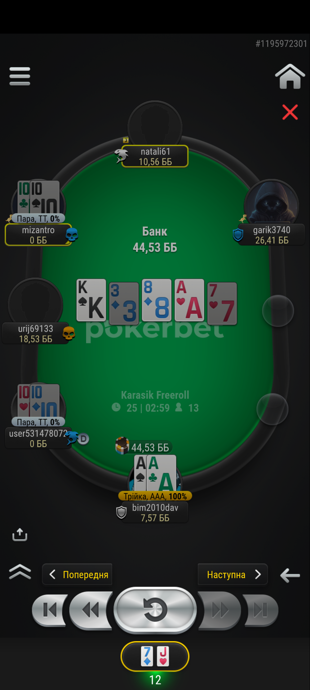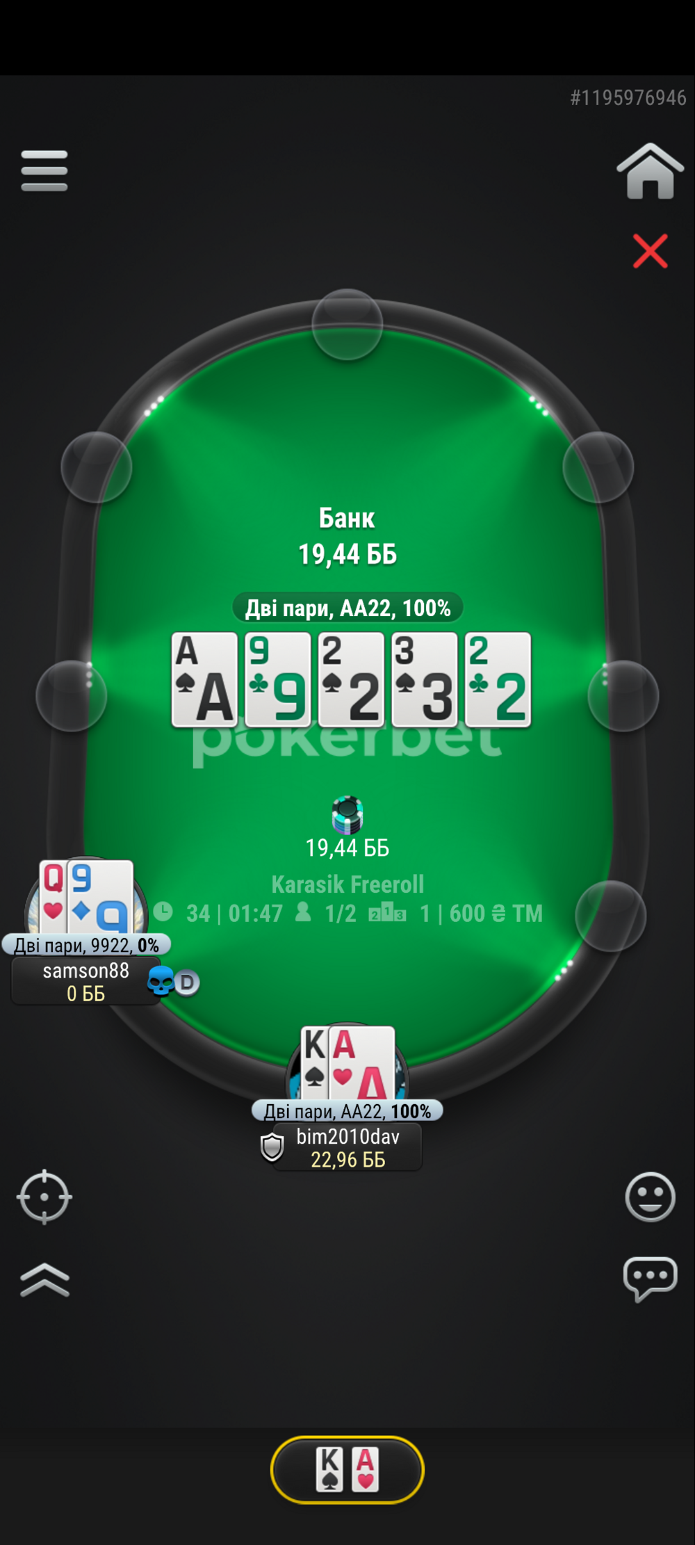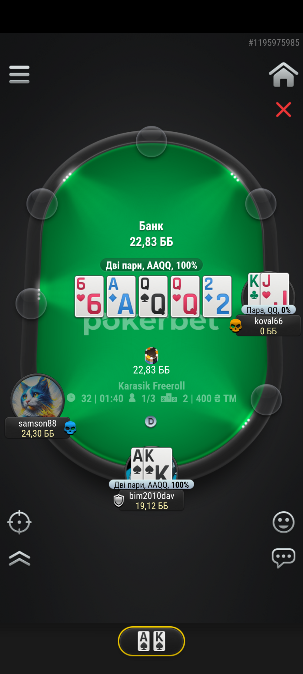 Нарешті мої АА вистояли проти двух пар десяток, далі були роздачі за фінальним столом.Перший нокаут був з QQ які теж вистояли проти АК.