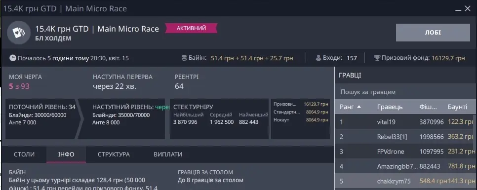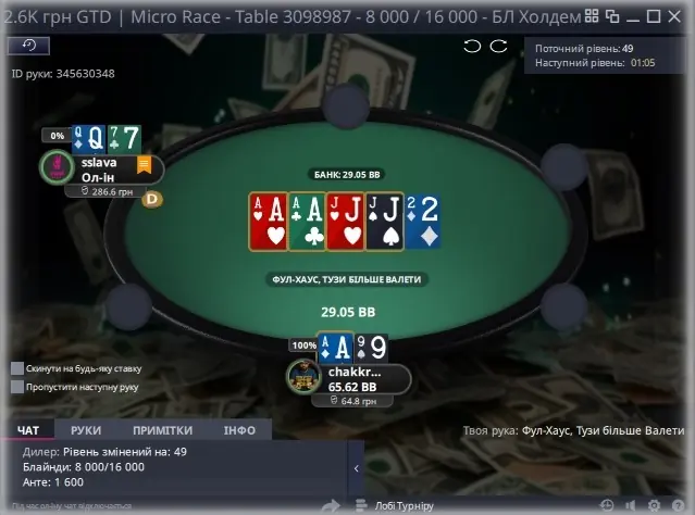 Виставився декілька разів підряд і став 2-м, і ось тут дійсно думав дочекатися ТОП-3, але ця помилка дорого коштувала. Гравці обмінювалися стеками, тільки я участі в цьому у не приймав. І знову 5-й.
