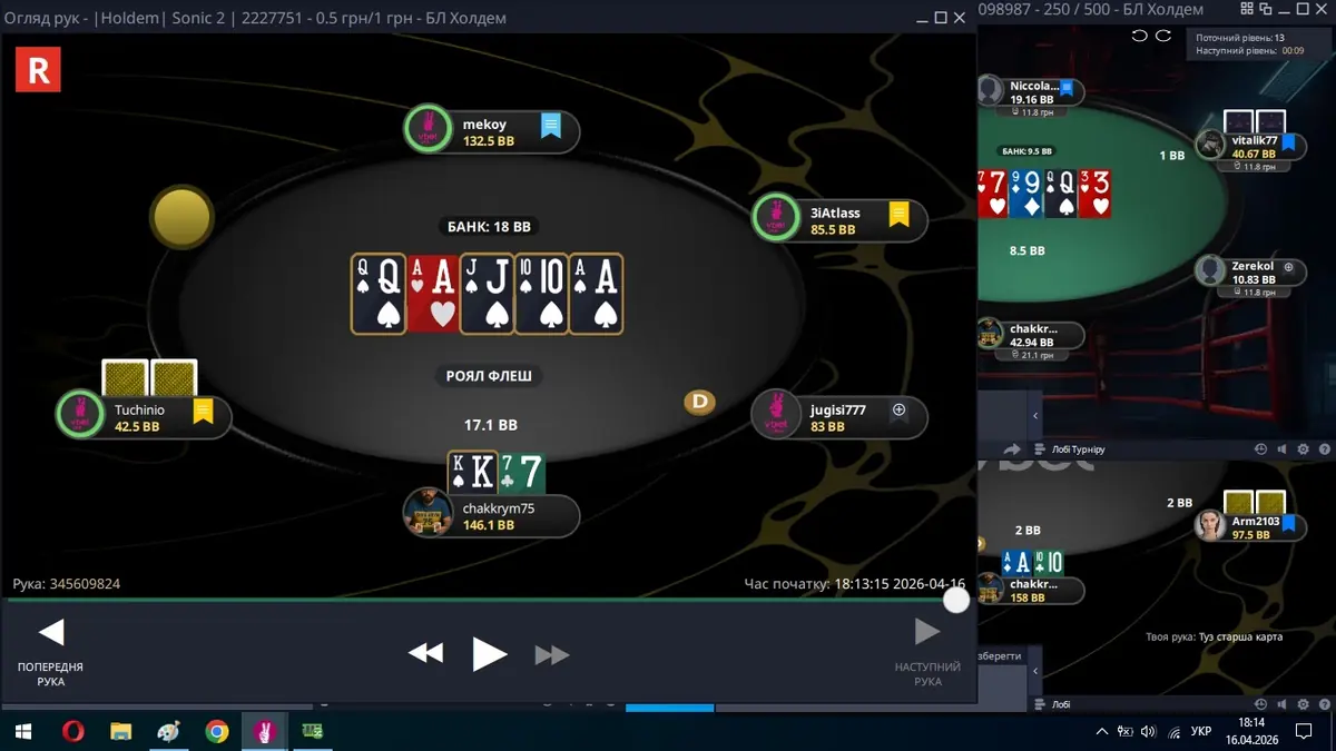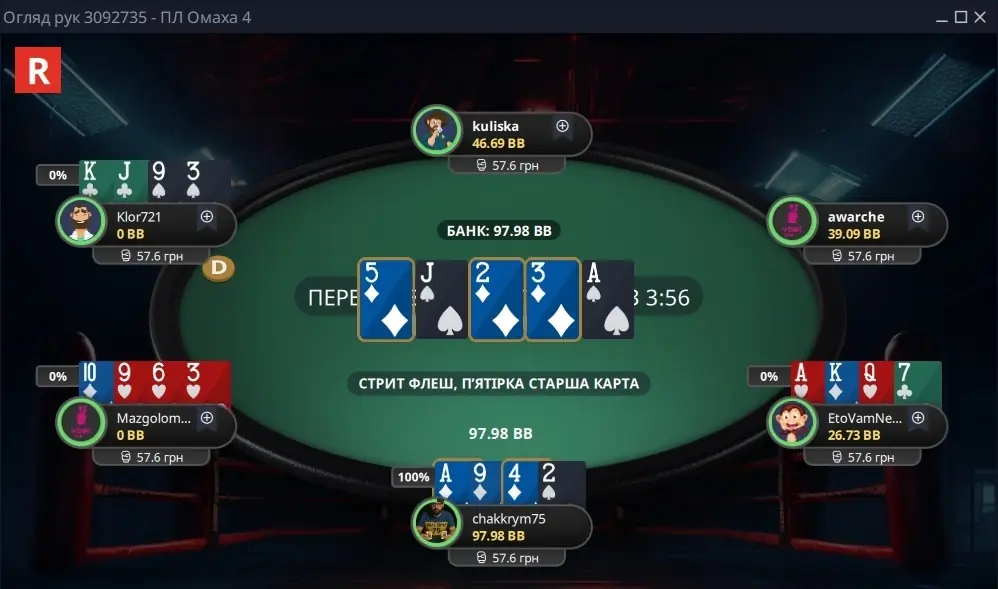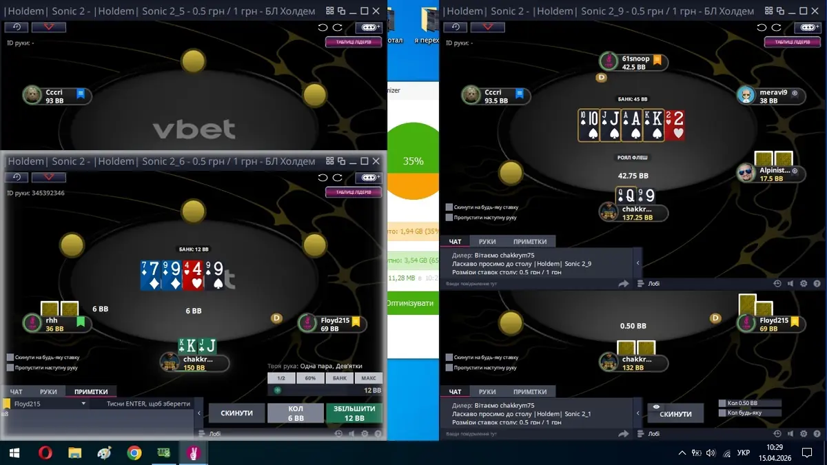 В мене зараз увійшло в звичку трохи повільніше входити в гру за кеш столами, але потім я набираю оберти і починаю гнути свою лінію, починаю робити гру під себе. В мене доволі різнобарвний сайзинг, він мені до вподоби, бо іншим гравцям він не дуже подобається, а це показник.