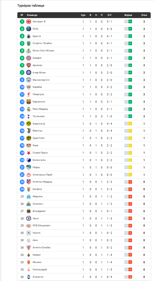 До Вашого відома таблиця Ліги чемпіонів після !-го туру.
