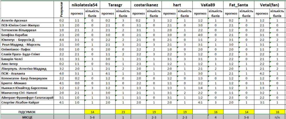 Таблиця конкурсу прогнозистів 1 туру ЛЧ