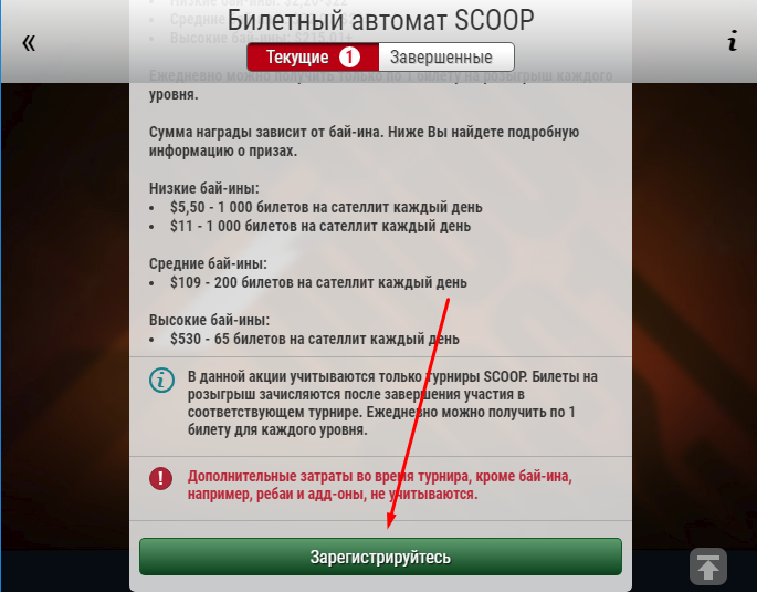 Після того як ви зіграєте турнір SCOOP - отримаєте квиток в щоденний розіграш. У день можна отримати не більше 3 квитків, але на 1 розіграш кожного рівня.