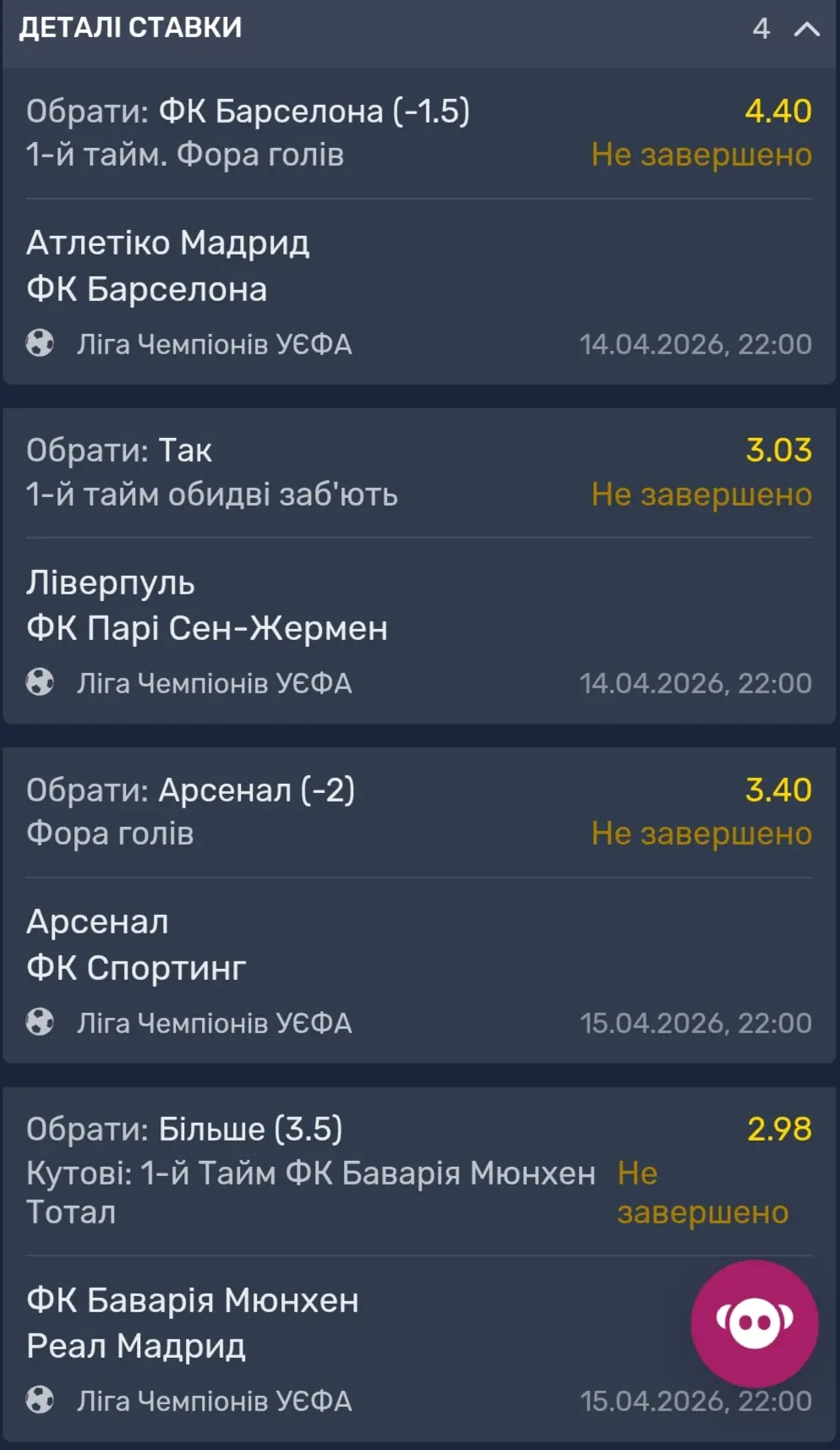Ну і останні в моєму експресі це Баварія - Реал Мадрид, на мою думку це найзаплутаніший матч, і хоч Баварія зараз краща і у них більше шансів, та Реал всеж не можна списувати до фінального свистка. А поставив я тут на те що Баварія подасть у першому таймі 4 кутові, на мою думку це доволі реально виглядає⚽️⚽️⚽️