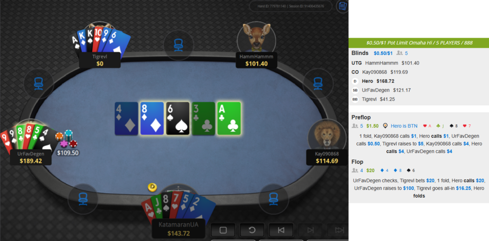 при найгіршому розкладі я їду менше 20% (так, з флопнутим натсом може бути менше двадцяти). префлоп-агресор мене не лякає. ще й зважаючи, шо фішок в нього небагато залишається, то там би я будь-який тьорн або колов, або сам виставляв на чек, бо у нього дуже широкий діапазон заходу.