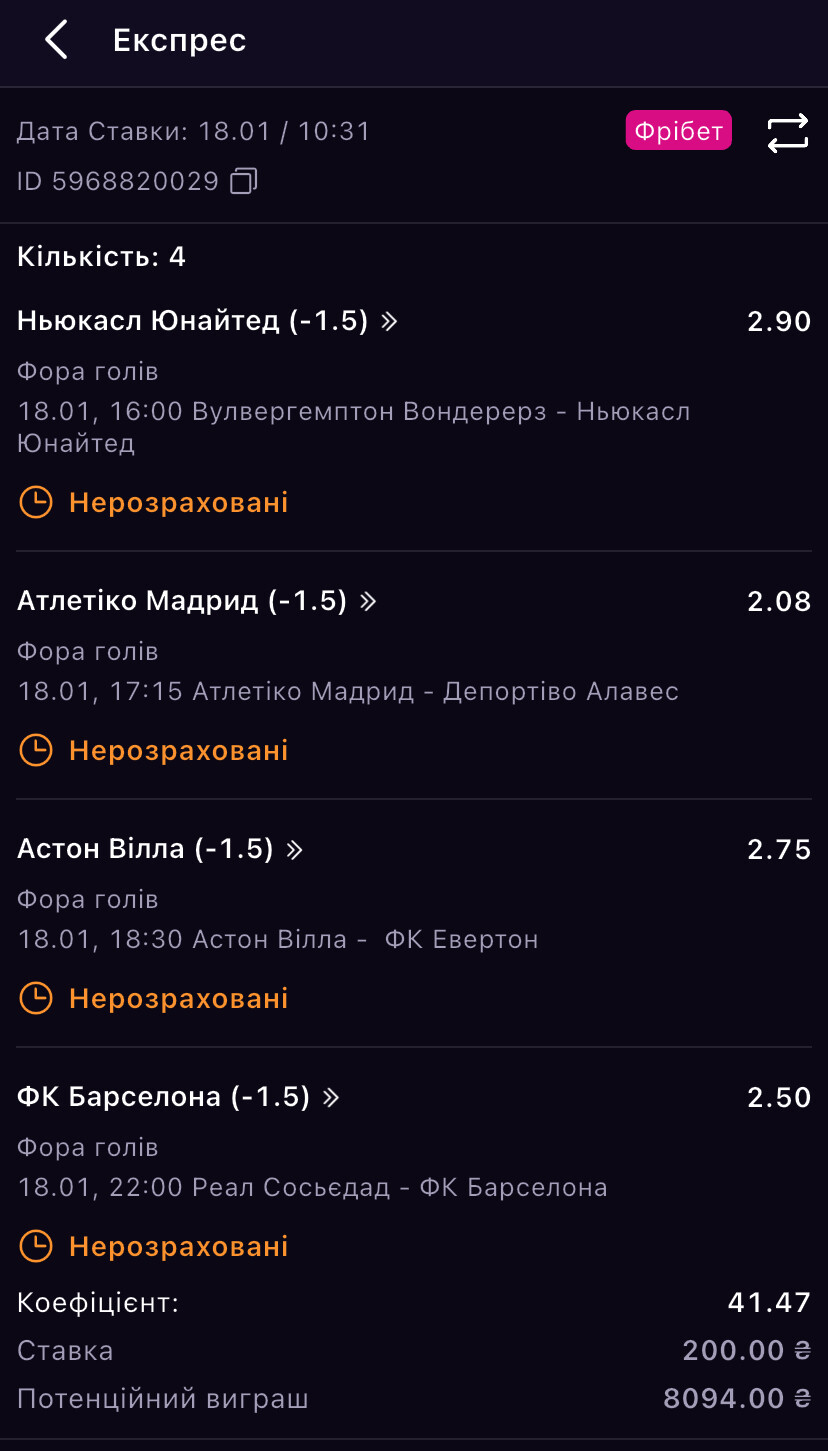 Давненько я не викладав ніяких ставок на спорт, а сьогодні на Vbet отримав фрібет на 200₴, поставив експрес з коефіцієнтом 41,47 і вирішив викласти: