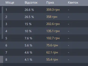 P.S. За друге місце давали лише не гривню менше призів. Але потрібно врахувати що отримую я ще і нагороду за вибиття останнього гравця також.