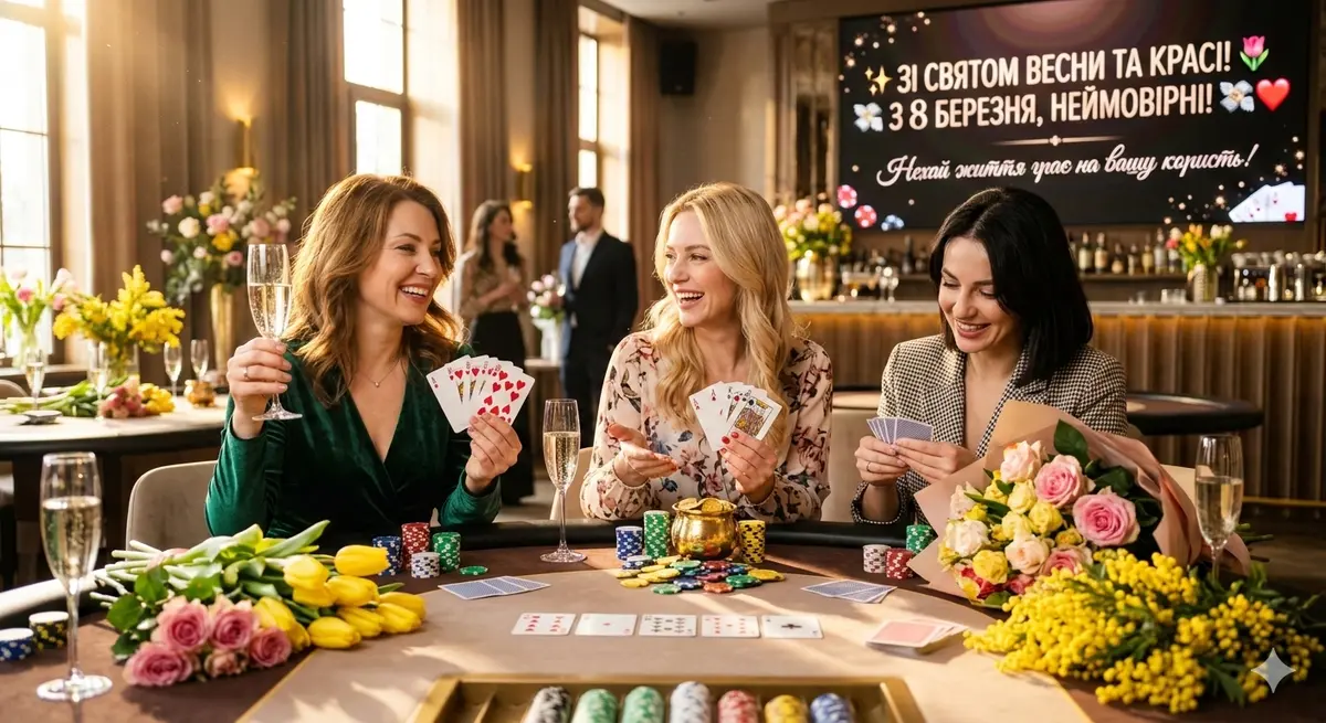 Вітаю вас із 8 Березня! Бажаю, щоб ваше життя було схоже на ідеальну партію в покер, де на руках у кожної завжди Роял-флеш, а удача — ваш незмінний партнер. 🃏💎
