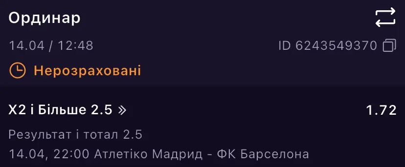 1) У матчі мадридського Атлетіко проти Барселони очікую на результативний футбол і вірю в каталонців, навіть не виключаю їхній камбек і прохід в 1/2 фіналу, але ставку зробив трошки з перестраховкою на Х2 і тотал більше 2,5: