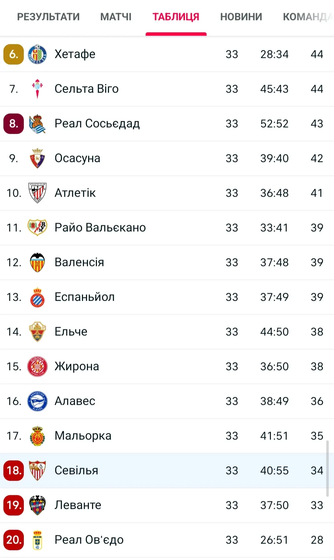 Тут ще цілих 5 турів до кінця, команди йдуть дуже щільно і зміни в таблиці будуть кожного туру, тому говорити ще рано, але якщо виліт таких команд, як Ов'єдо,Леванте,Мальорка,Алавес,Жирона, Ельче, Райо Вальєкано нікого не здивує, то такі імена як Севілья і Валенсія точно стануть приводом для розмов ☝️