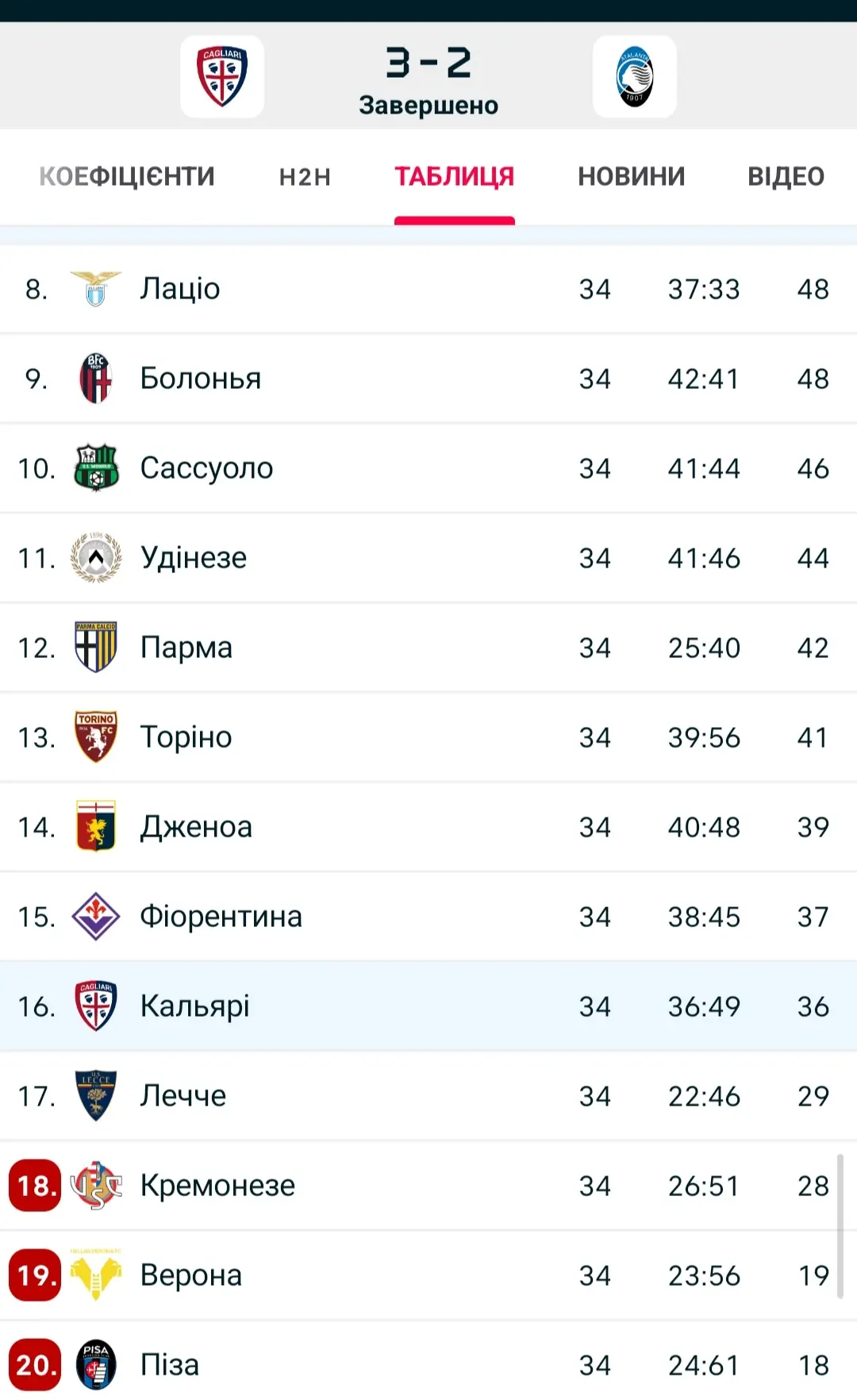 Кальярі завдяки перемозі над Аталантою в останньому турі практично гарантував собі місце на наступний сезон.