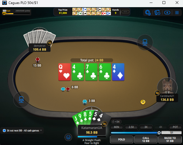 тобто да, для когось в мене упоротий імідж (вони просто не дивляться глибше і не бачать суті), але не в ситуації пуша на ререйз рівера. в принципі, тут і каре заривається, аби в мене не висіла 4, яка його блокала... аргументи за кол можуть бути, але тут таки краще пасувати. а ще краще без першого натсу зіграти простий кол на бет.