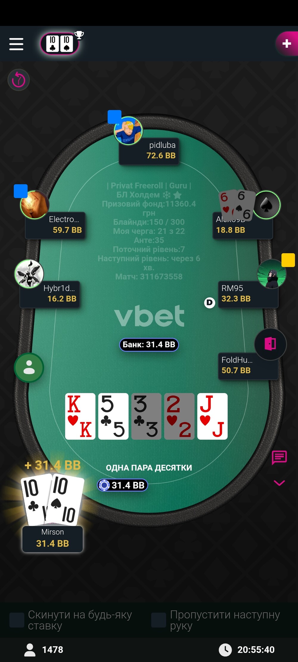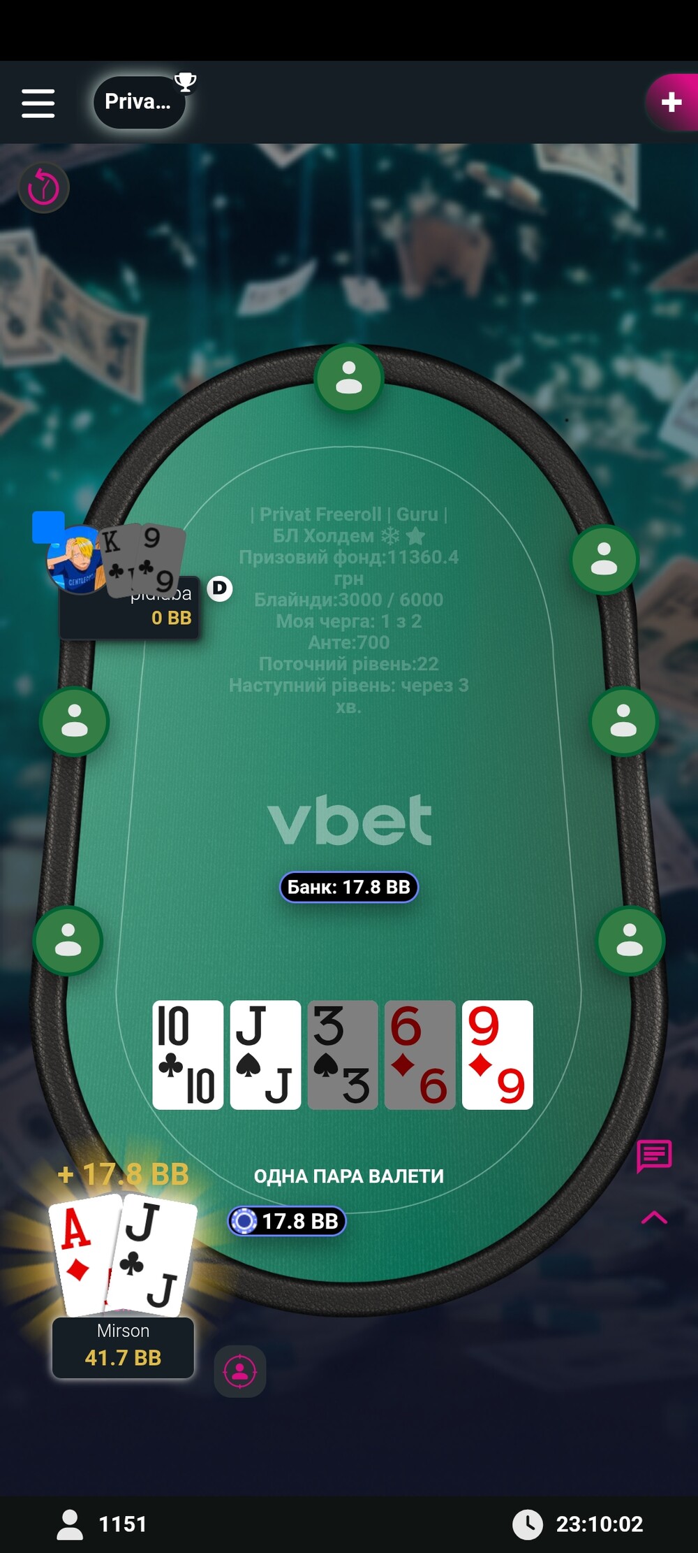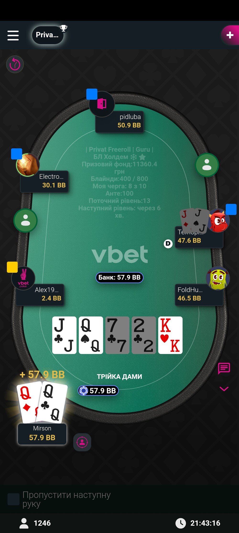 Вітаю! Крутий результат і гарна гра💪. Коли грали за одним столом, ловив себе на думці, що стиль гри десь схожий на мій, тепер зрозумів чому) Я теж зазвичай починаю хомку ще десь в дорозі додому, а потім ще й паралельно якимось справами займаюсь, тому не дуже часто заходжу в роздачі. Проте коли вже заходжу, намагаюсь відіграти максимально адекватно)