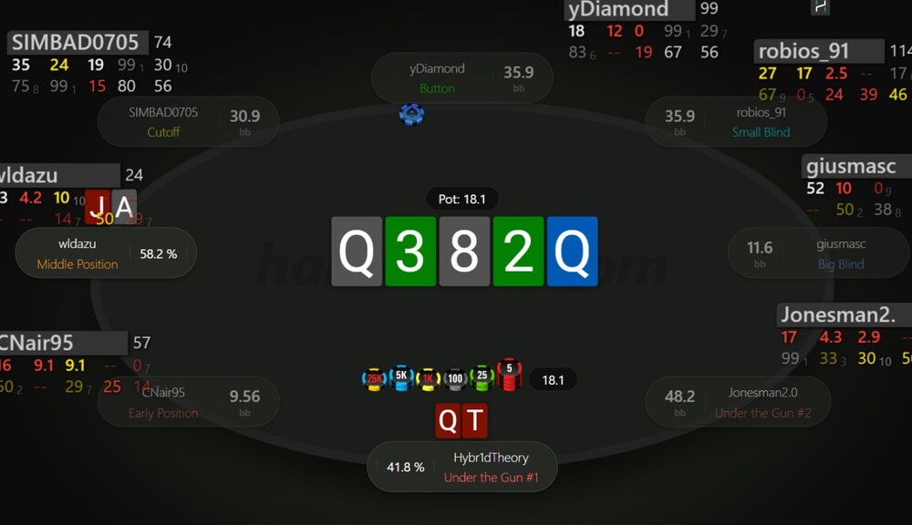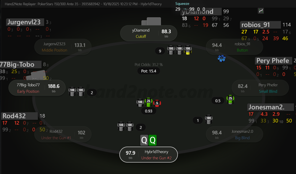 Це прям одна з перших роздач, стеки 100 bb. Я на UTG, відкриваю QQ рейзом 2 bb, отримую кол від LJ і сквіз 9 bb від СО, всі інші - пас. Що робимо?