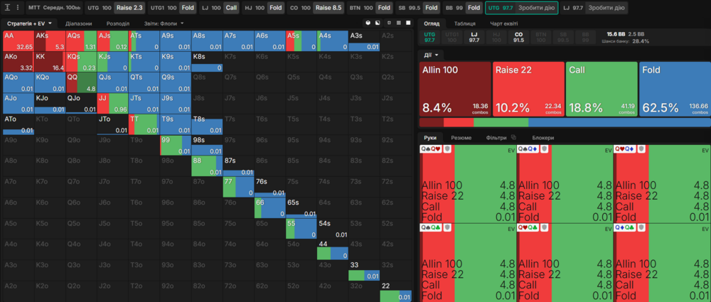 Ось так пропонує грати солвер на моєму місці. Нажаль випадково натиснув на А2с замість 95с, але розподіл там майже такий самий - 100% пуш.