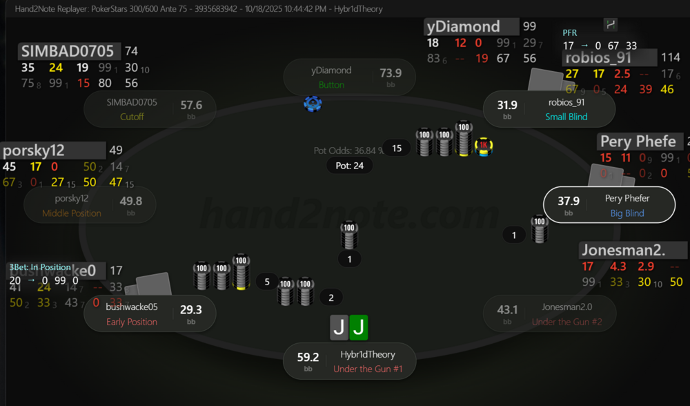 Знов рання позиція і знову пригоди) Я (61 бб) відкриваю JJ з UTG+1, отримую невеликий трибет 5 бб від LJ (34 ББ), а далі колд 4бет 15 бб від SB (46 бб)🥶! Які наші дії?)