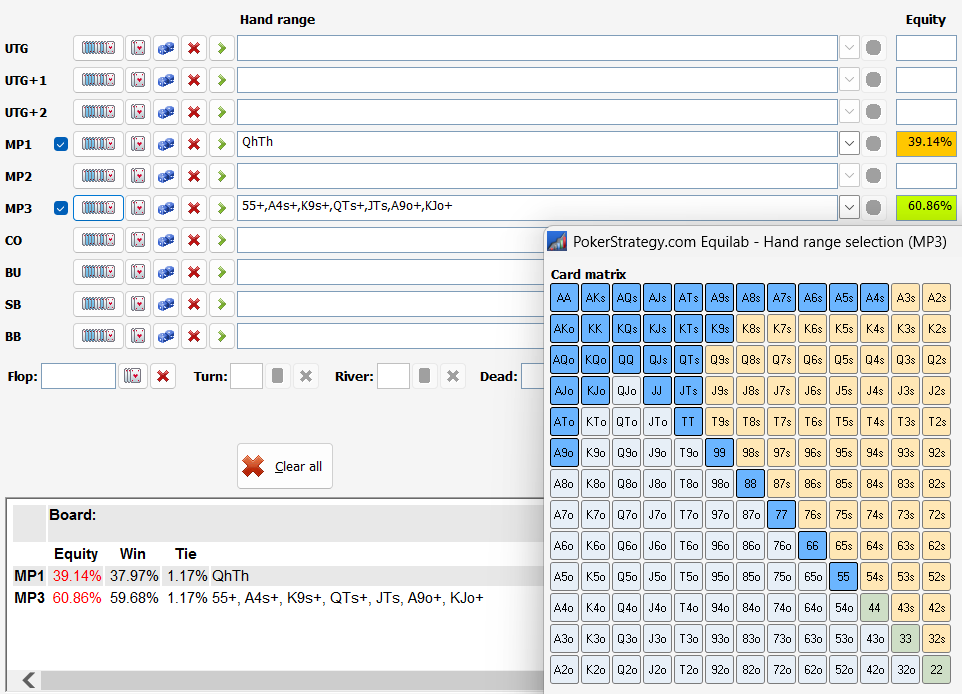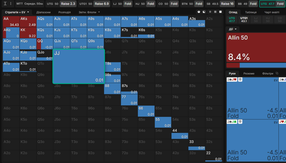 Я з думкою "Та ну нафіг, я пас" натискаю фолд, наступний боєць теж фолд. Майже плоский трибет з раньої в ранню це вже трохи насторожує, а ось діапазон 4бету вхолодну проти такого екшену страшно уявити😁. З приводу конкретно цієї руки в мене немає сумнівів, але стало цікаво порахувати з чим ми тут далі можемо продовжувати гру. Розрахунок для середнього стеку 50 бб, це звісно не зовсім точно, але приблизно дає зрозуміти суть (під спойлером).