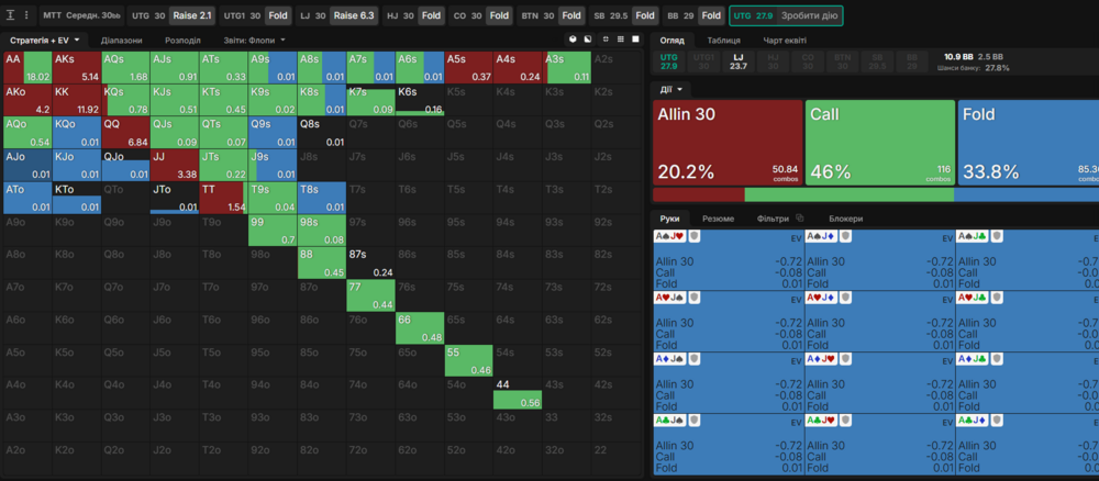 Тобто в такій ситації навіть QQ і АКо - фолд! Маємо лише одну опцію - пуш з діапазоном АКс, КК, АА😀. Звісно ГТО це лише "патерн", а у грі треба дивитися на опонентів, проти якогось агрофіша можна як раз відправити в пуш ті ж АКо і QQ. В цілому я ці дії "з вагою" в ГТО сприймаю як ті, які ми робимо, якщо "не поважаємо" опонента😅, от вам і найкращий рандомайзер)