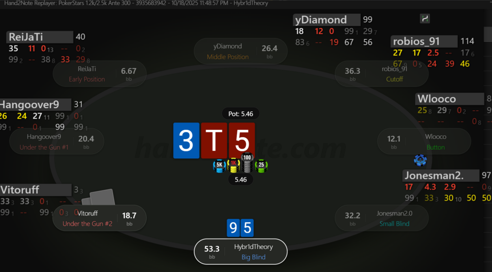 Ця роздача зіграна не на прямому баблі, але вже доволі близько до нього. Опонент (20 бб) опен рейз з UTG, всі пас, я на ВВ (55 бб, чіплідер стола) захищаю 95s. Короткий стек рейзить з раньої в ВВ чіпака, діапазон там точно дуже сильний, але 95s все одно входить в наш рендж колу на ВВ. Виходить ось такий флоп:
