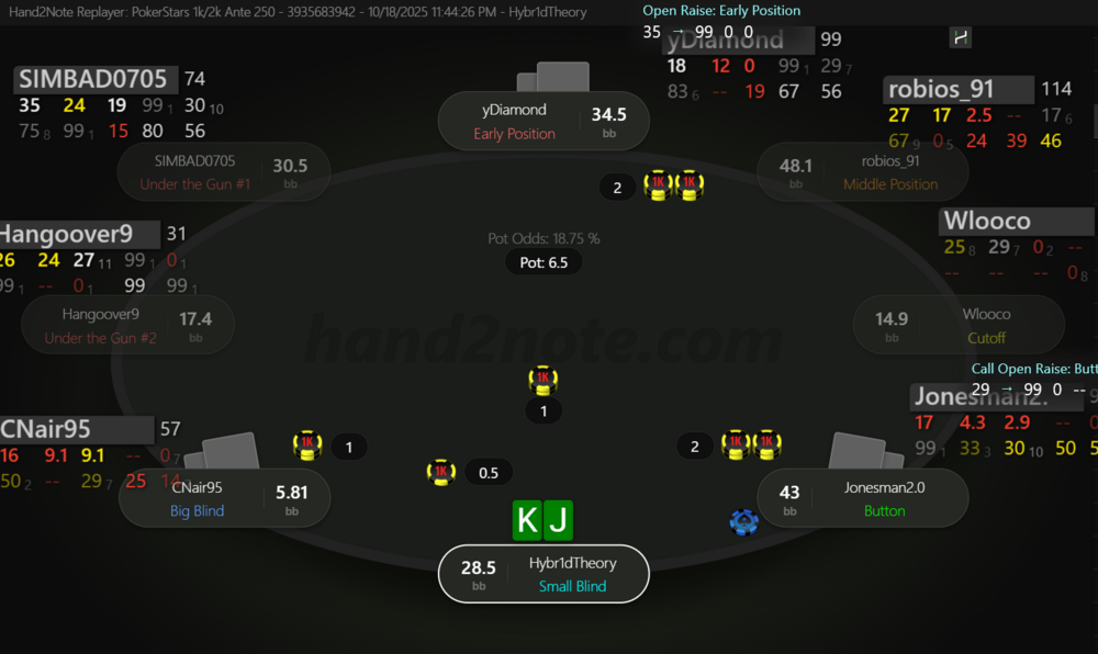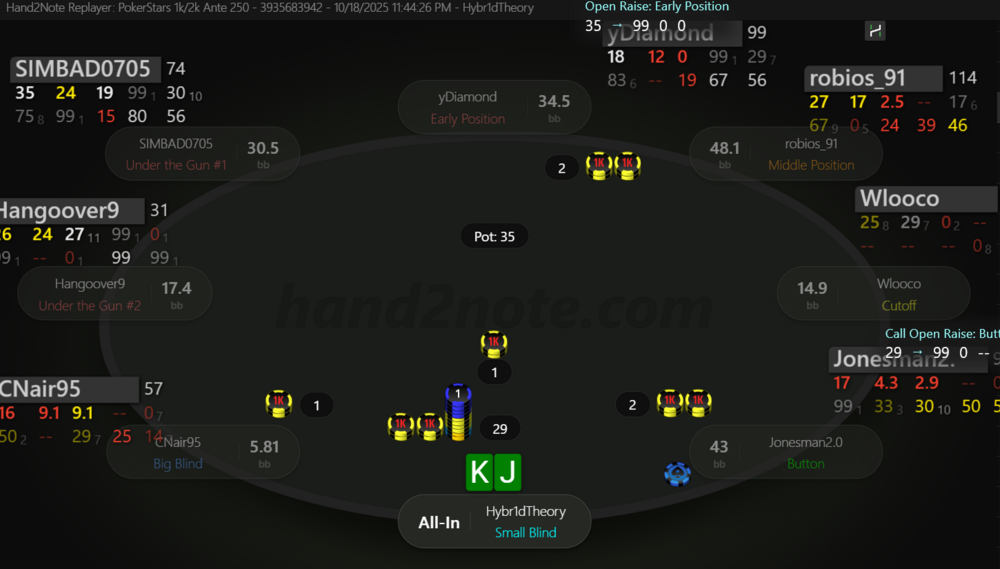 Той самий рівень, кінець пізньої реєстрації. LJ (Тайтовий рег, стек 36 бб) опен рейз 2 бб, BU (45 бб) - кол, я на SB з KJs.