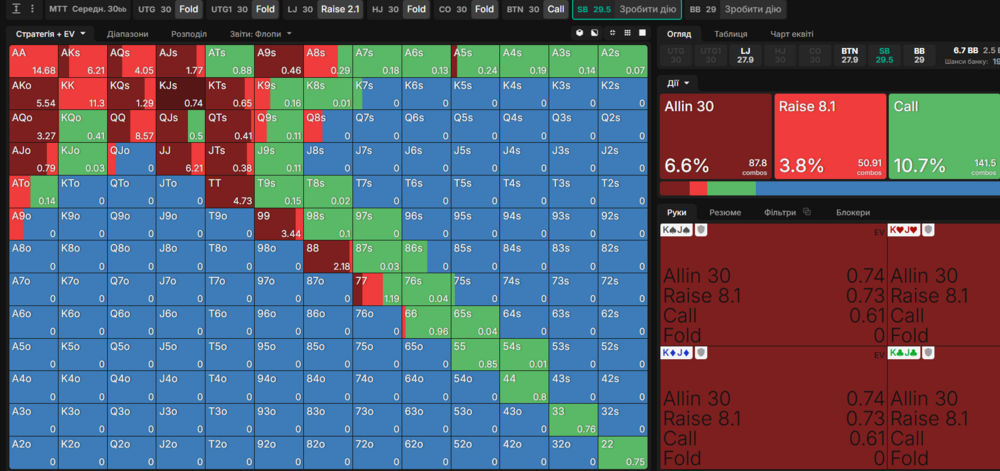 Думаю більшість з вас одразу подумали, що це гарна ситуація для сквіза, і я під час гри звісно теж) І от я замислився на сайзінгом. Стандартний розмір сквіза в такій ситуації буде десь 9 бб, бо ми без пози, а це майже третина мого стеку. Якщо хтось з опонентів заколить, то ми виходимо на флоп з СПР менше 1 без позиції і часто вже на флопі приймаємо рішення на стек. Тому я вирішую зіграти прямим пушем на 30 бб. Я пам'ятав як колись в розрахунках бачив, що солвер в подібних стеках з деякими одномасними бродвейними руками хоче грати прямим пушем, але не пам'ятав подробиць і не був впевнений.