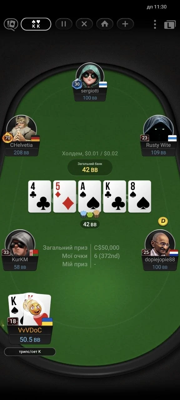 Далі роздача з KK. Думаю, тут я трохи переагресував. Ймовірно, у нього були руки типу Ax, але мої великі ставки вибили його, і я не добрав.