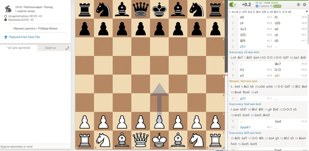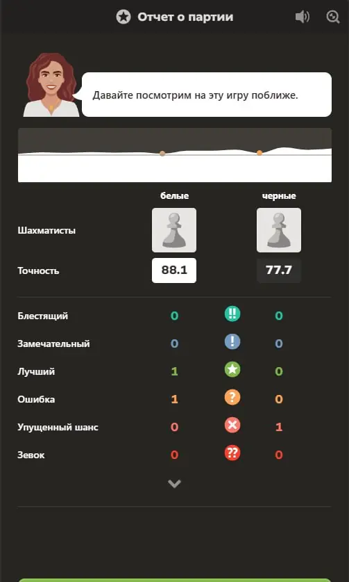 Точність ходів 88% на 77%.не саме більше що Я бачив в своїх партіях.