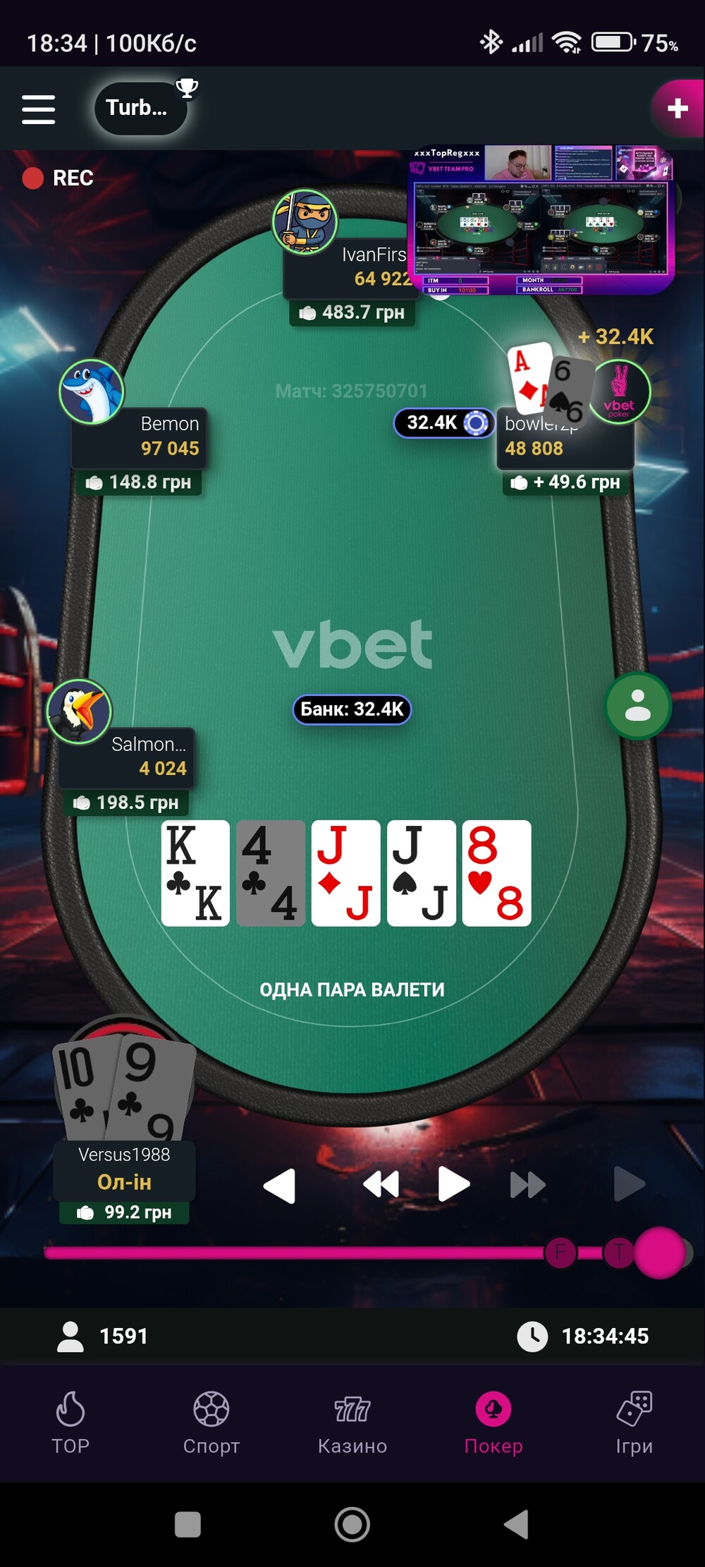 Була ще одна роздача та все таки опонент дотягнув флеш