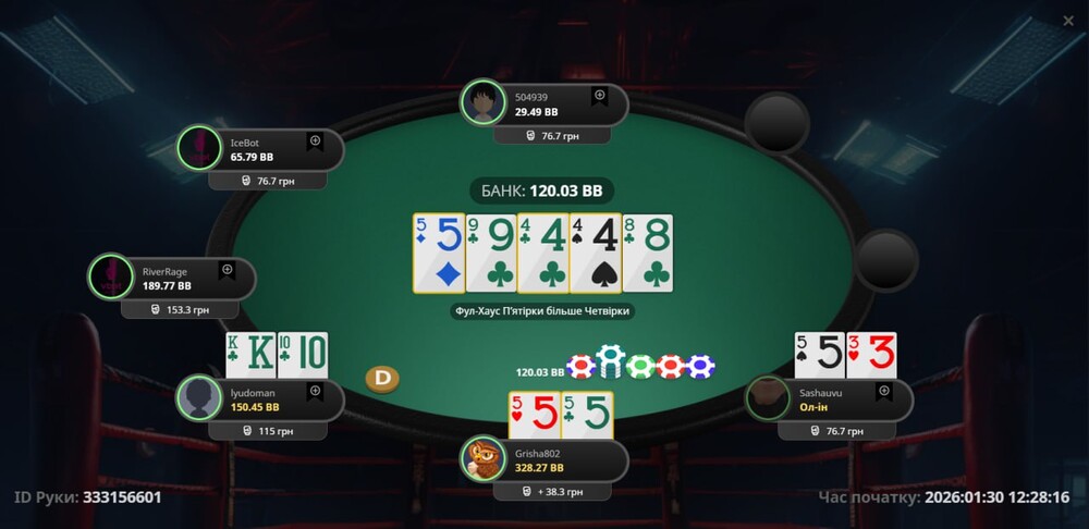 АА відкриває 2 бб.Заходить батон,я і ББ.По флопу АА ставить щось приблизно 5 бб.Я думаю і колю,по тьорну АА ставить приблизно 9бб.Я думаю і не знаходжу ні рейзу ні пуща, колю.На рівері АА ставить 7бб.Я думаю і теж колю чи був в мене пуш?Сиділи ми за столом довго.Більше 2 години.Могли бути А10 і А з чирвою яка не закрились,сети теж могли бути.По суті грав чек ,кол.-телефон.Не вірна лінія?