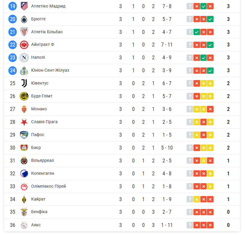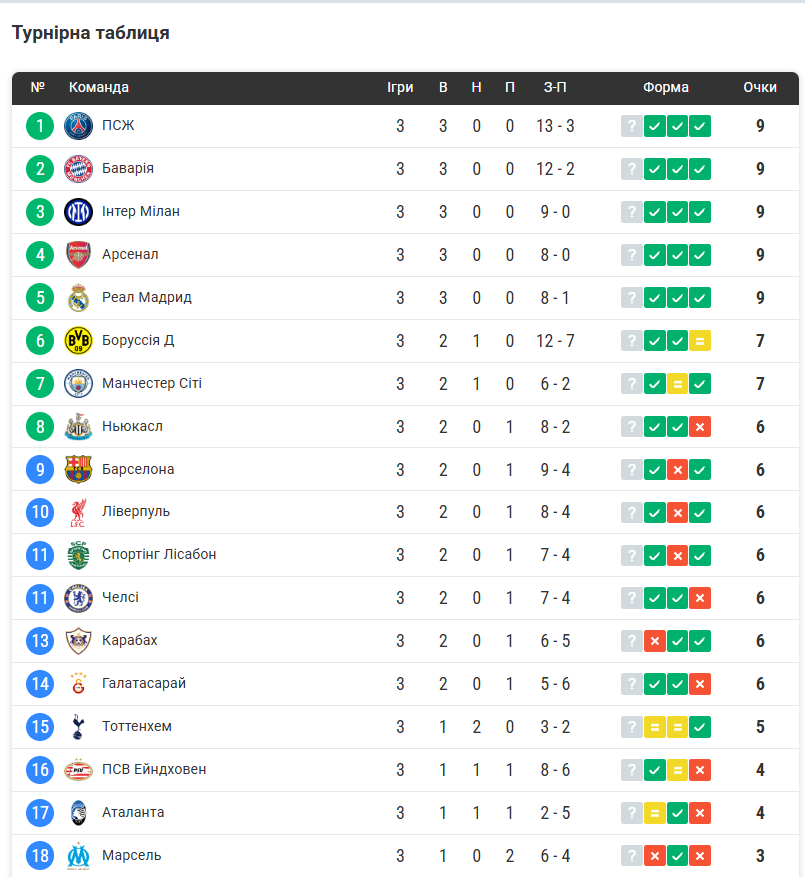 Після 3 турів лідирують ПСЖ, Баварія, Інтер, Арсенал та Реал Мадрид (по 9 очок).
