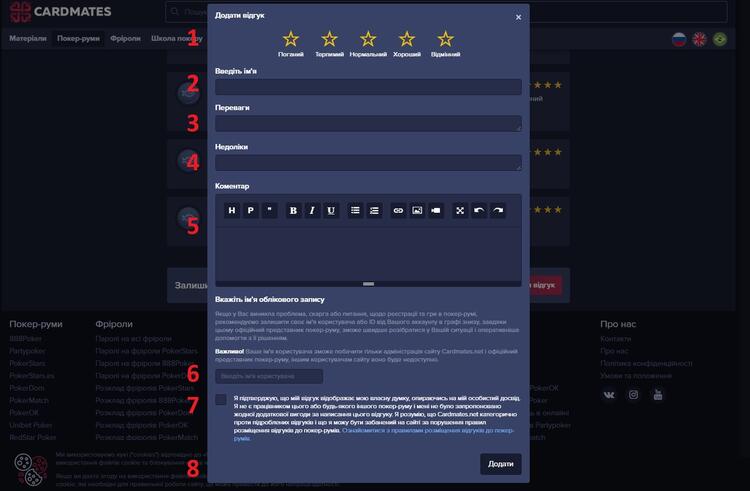 - Коментар – ваш чесний відгук про покер-рум, оснований на вашому особистому досвіді.