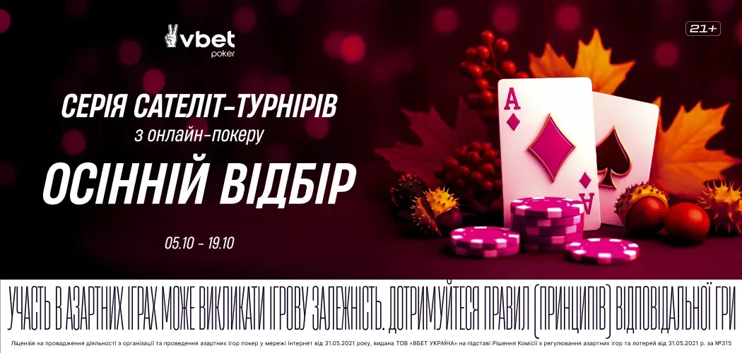 VBET Poker запускає серію сателіт-турнірів «Осінній відбір», в яких будуть розіграні квитки на ключові події останнього етапу ЧУ. «Осінній відбір» буде тривати два тижні з 5 по 19 жовтня, а схема відбору в цільові турніри виглядатиме наступним чином: