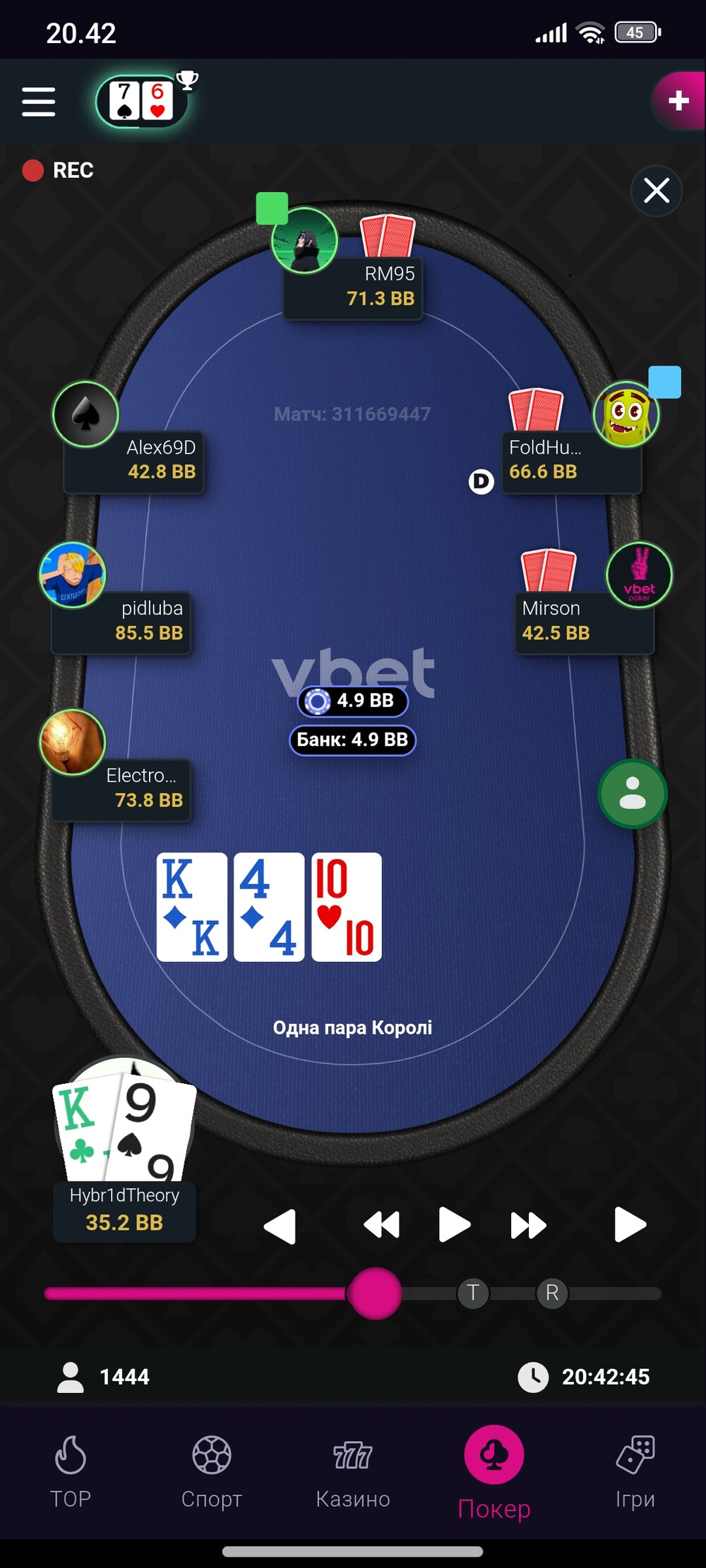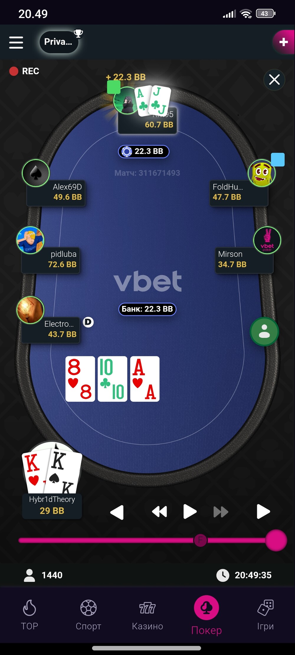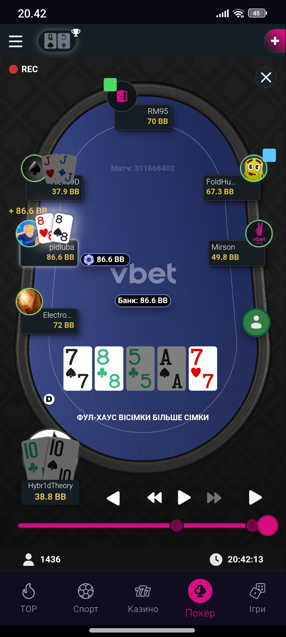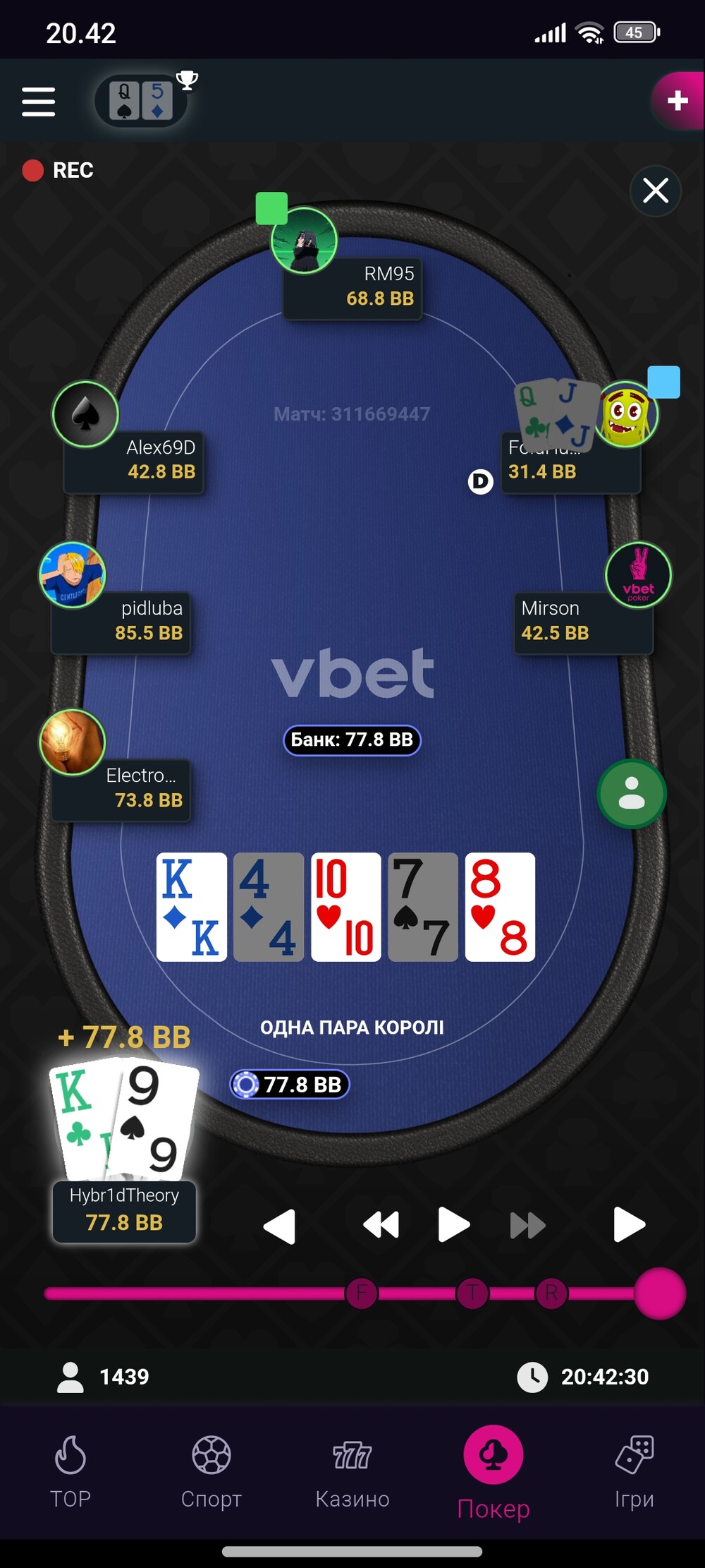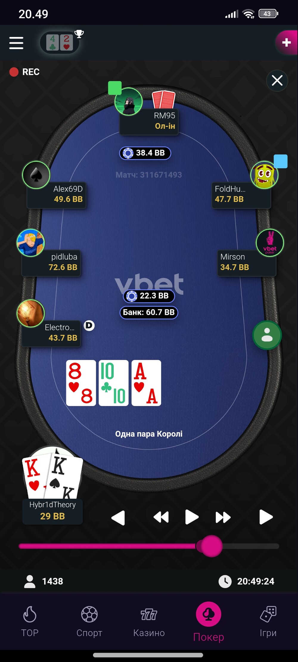 До цього ще була роздача де я в схожій ситуації (3-вей пот з чек-пушем з SB на флопі) на флопі 789 викинув нижній допер 78, тут у малого блайнду був готовий стріт з флопа 56. Суперники поїхали, терном прийшла 8, яка б закрила мені ФХ. Чи засмутився я? Аж ні трохи! Бо я приймав це рішення на флопі, в цій ситуації я був молодше і викинув, отже рішення правильне і я задоволений насолоджуюсь гарним пасом😊