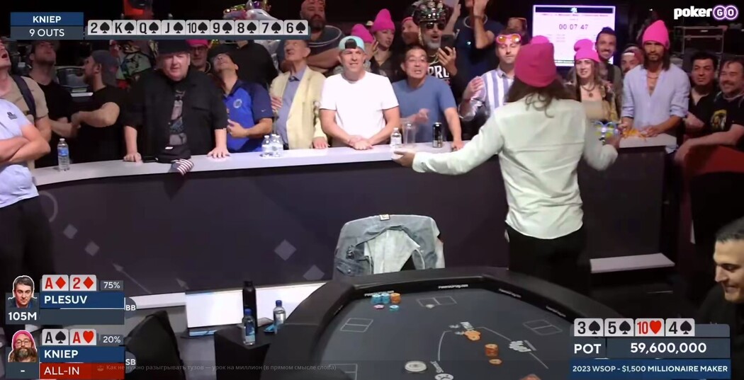 Роздача, яка вплинула на подальшу долю трофею, відбулась в 4-макс. На префлопі Флорін зіграв рейзом 4 000 000 з Q-J, а Кнеп сказав просто кол з кишеньковими тузами. Плешув з А-2 йде в олл-ін та Кнеп каже кол. Після цього радісно показує А-А своїм вболівальникам.