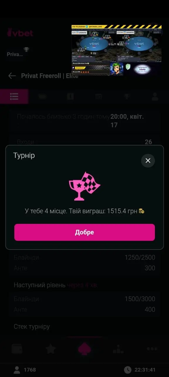 Далі, маючи топ3 стек в турнірі я більше не виграв роздач, хоч і їхав непогано. Як підсумок - 17 місце і 16820 грн™ призових. Результатом задоволений. Адже це куди краще ніж минулого разу за топ 3