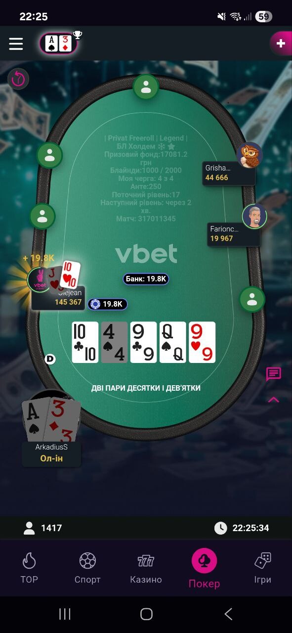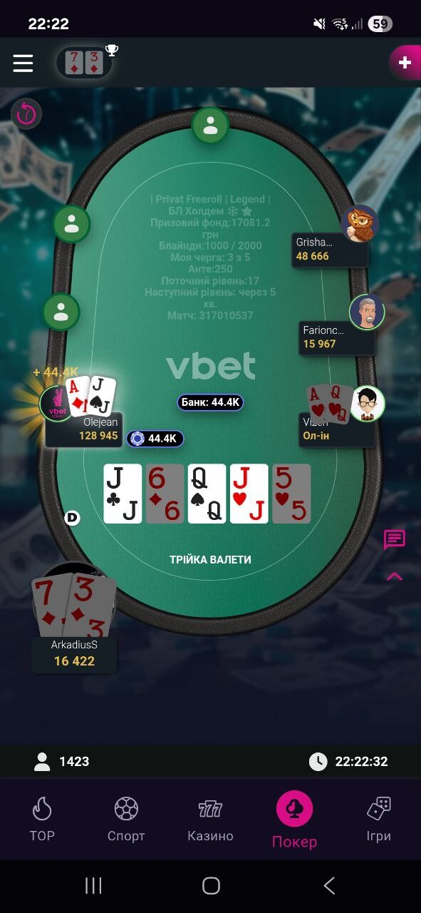 Зі змінним успіхом дістався фінального столу, був із 6 стеком. На моє щастя чи ні, був там гравець з ніком Olejean, ось йому заходило і як тільки не доїжджало, він вибив практично всіх за столом.