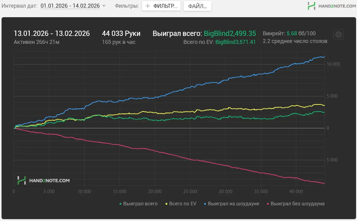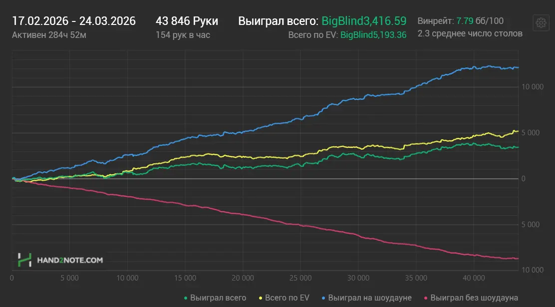 Зіграно 44 тис. рук, 8 ЕВбб/100 (реальних 5,6), недодало.