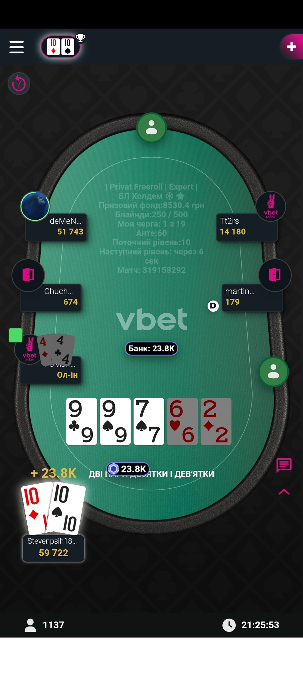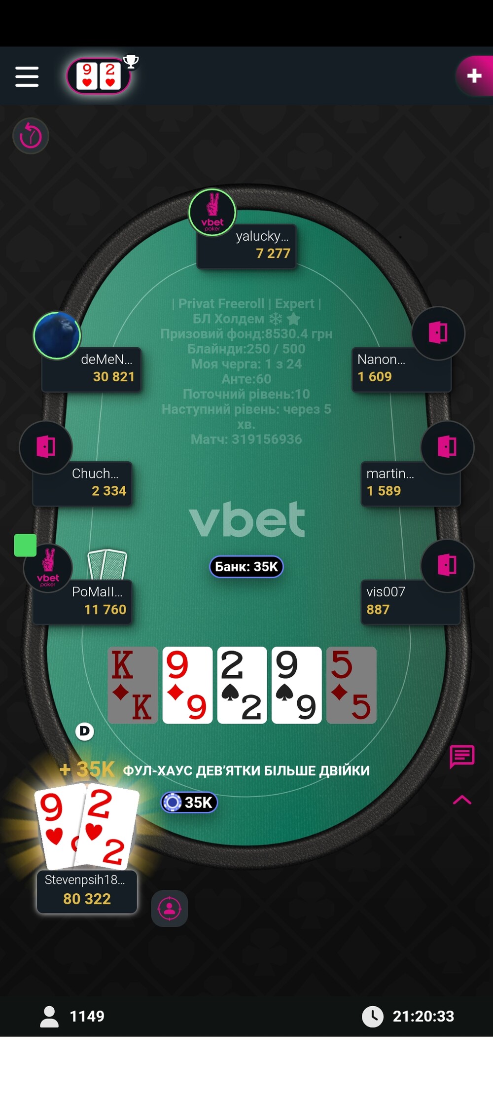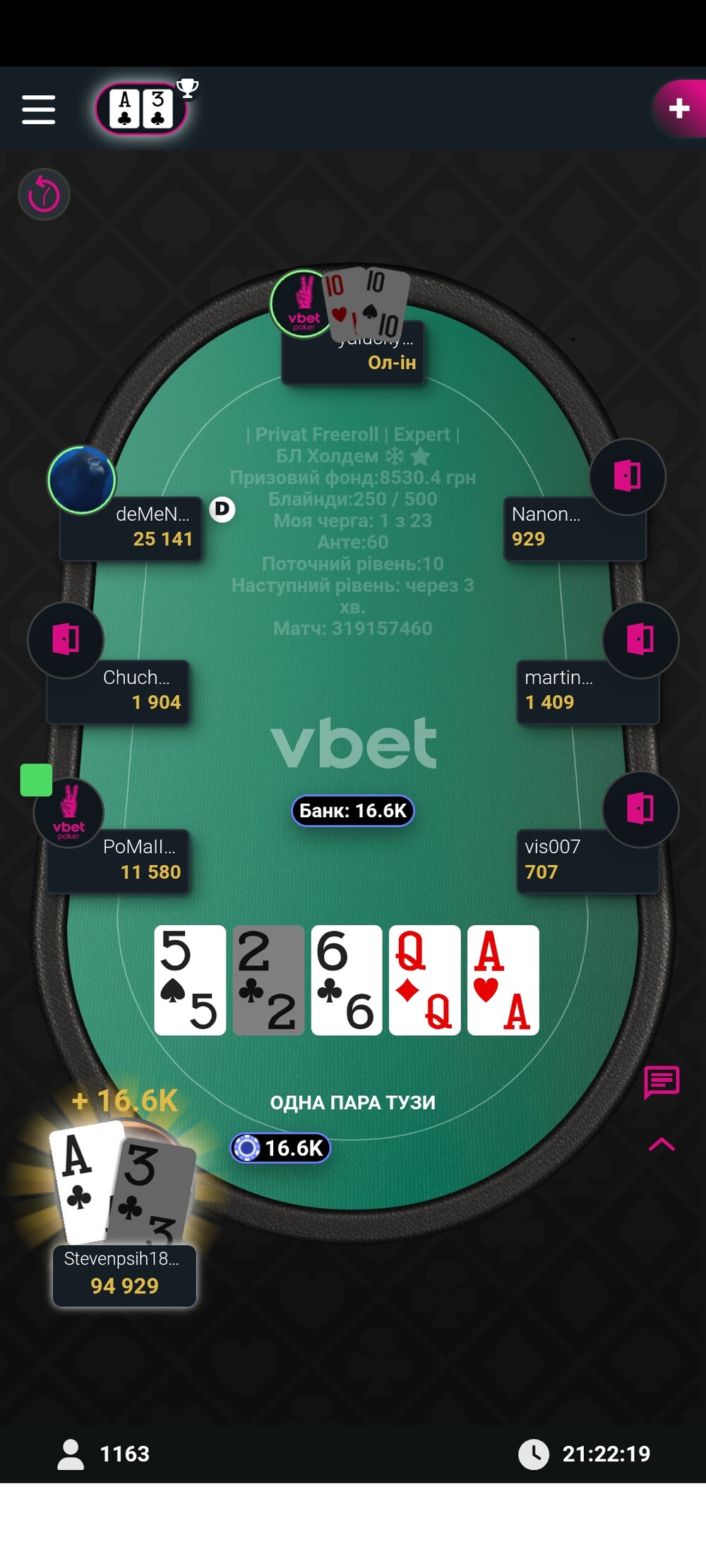 Зазвичай я відлітав ще за першим столом від більш досвідчених гравців,а іноді тому що банально не було часу на покер, але цього разу зорі зійшлись і фарт був на моєму боці протягом всього турніру, перло так перло :)😁